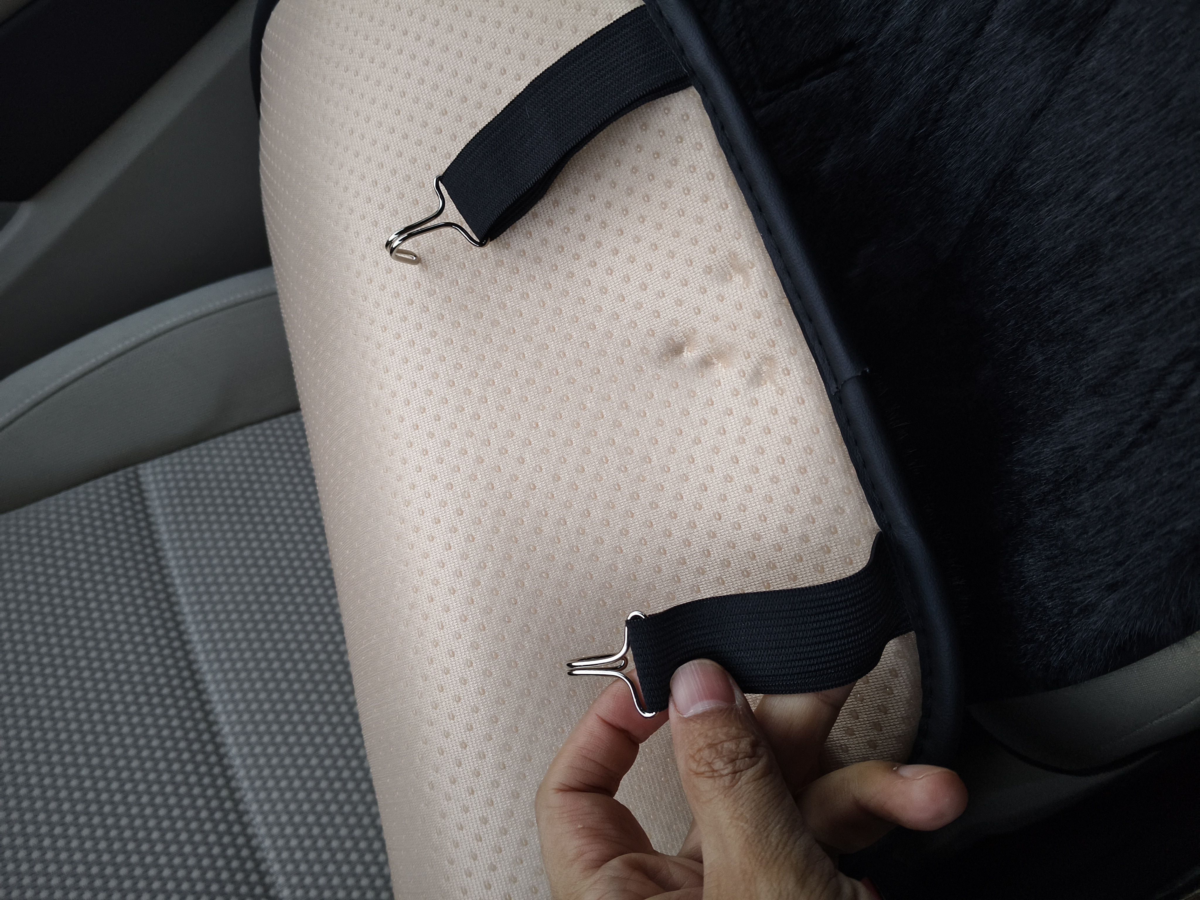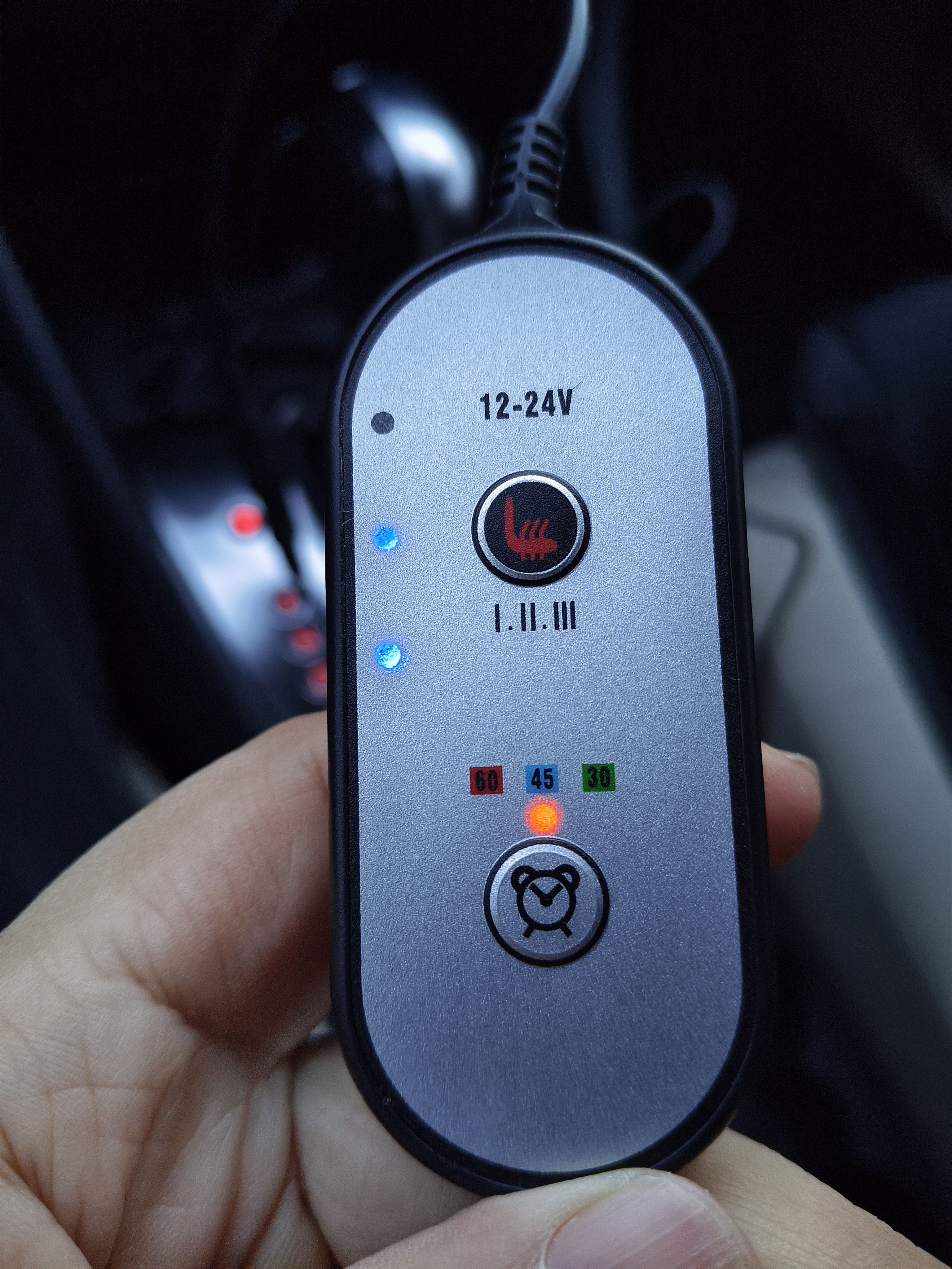 车没有座椅加热功能的朋友往下看,石墨烯加热垫【主副双座】,控制器上有两个按钮,一个是开关,有三挡;一个是定时关闭,时间分别是30.45.60,垫子加热速度快,两三分钟就有感觉了,屁股和后背都是热的,垫子末端是铁钩,靠背中段是塑料插拔卡扣、主驾驶和副驾驶的垫是一样的,它俩之间需要用线连接,点烟器取电,商家介绍垫子是重力感应,人离开就断电,我每次直接熄火下车,某东买的350左右,不是广告。