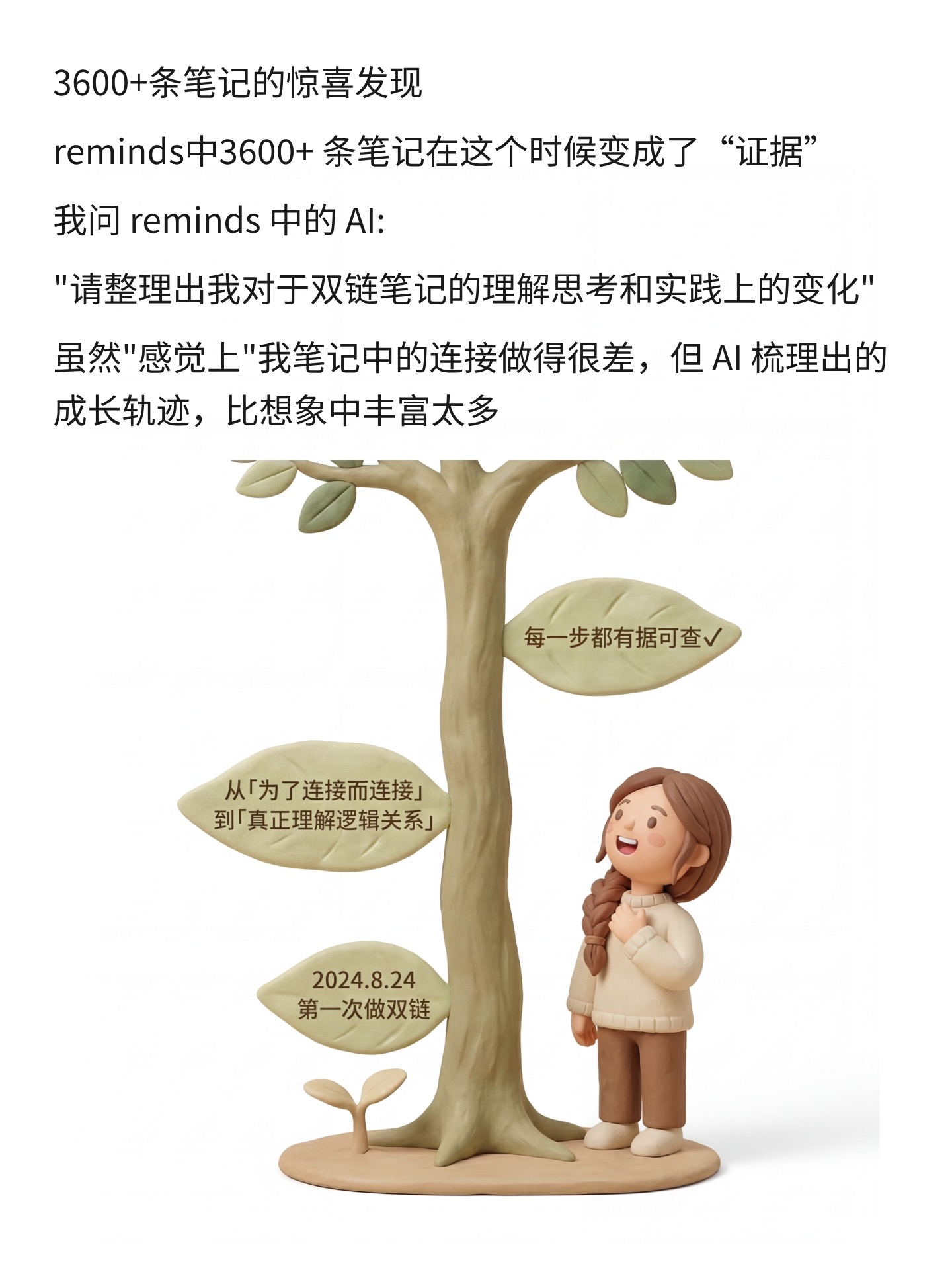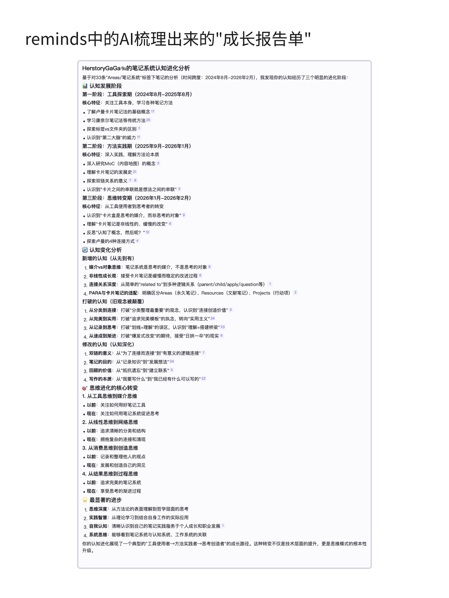 它会把你散落的积累重新组织,主题、脉络、关联全都出来。你日拱一卒存下的东西,第一次有了形状。