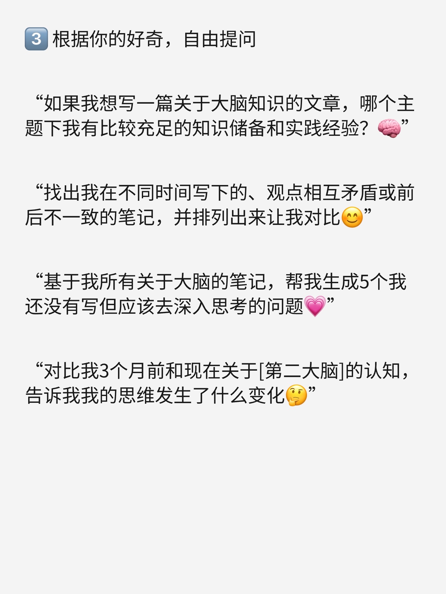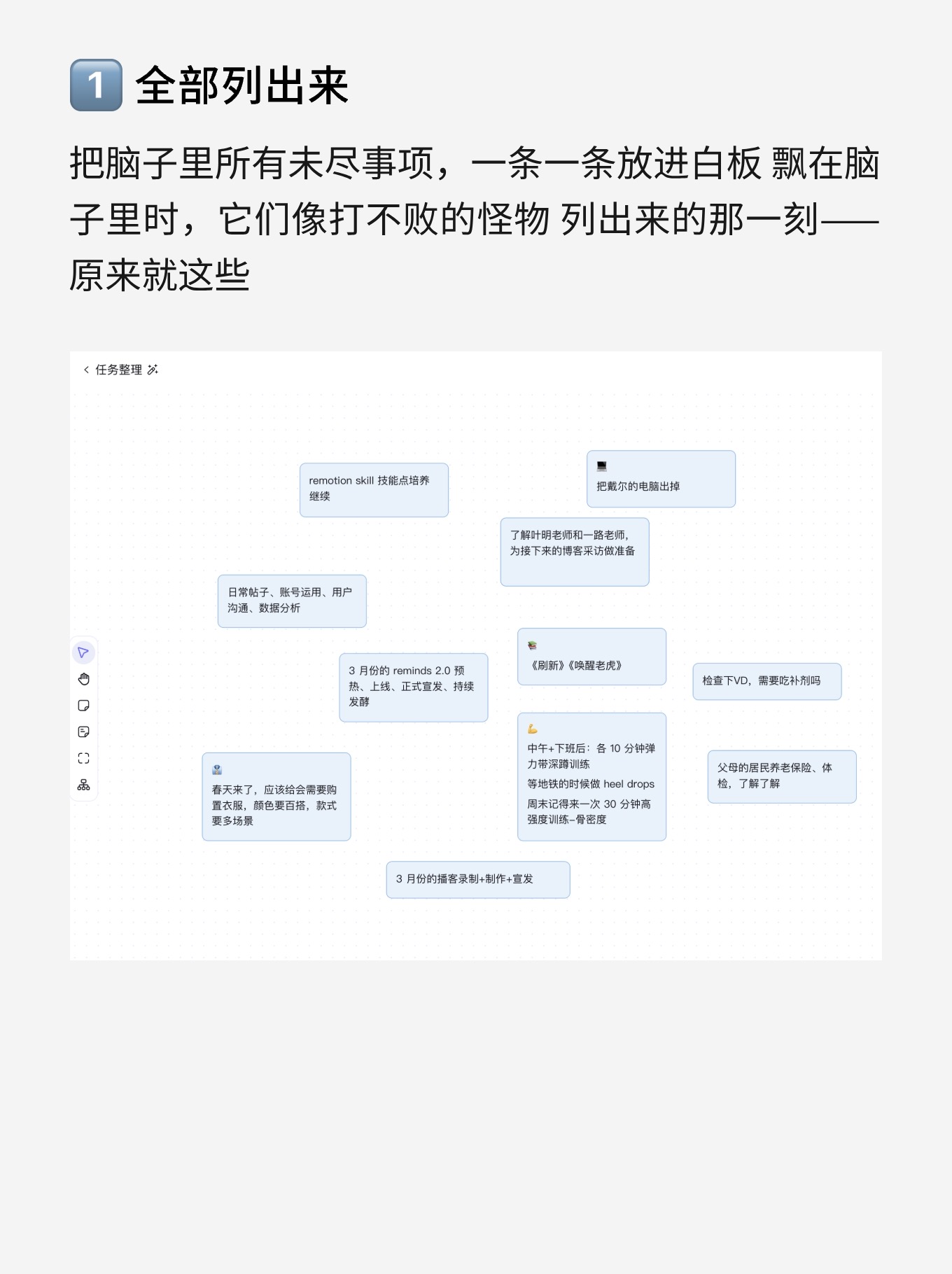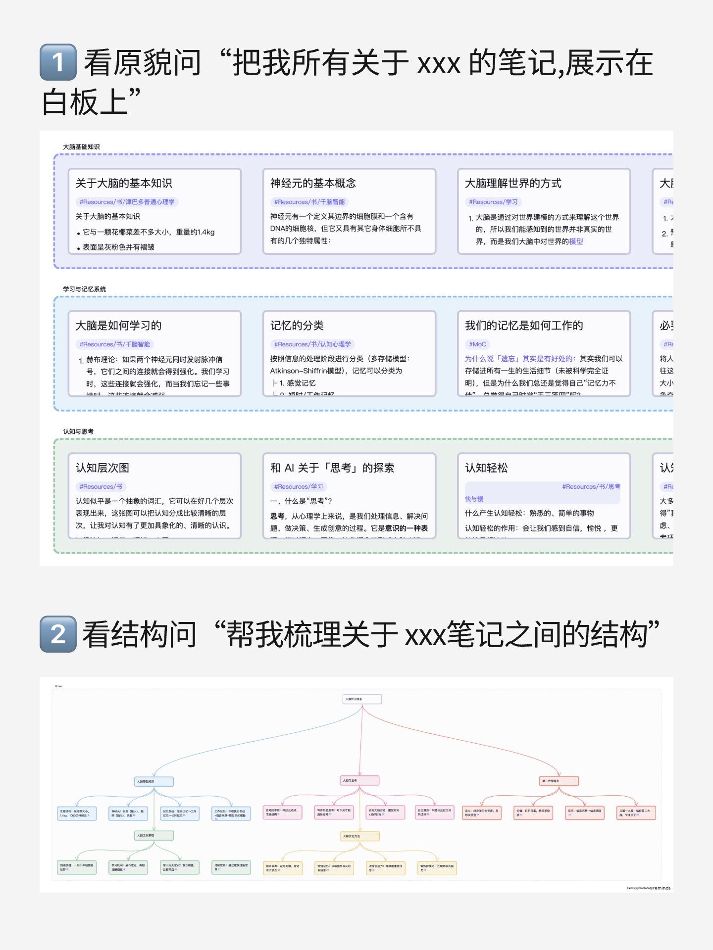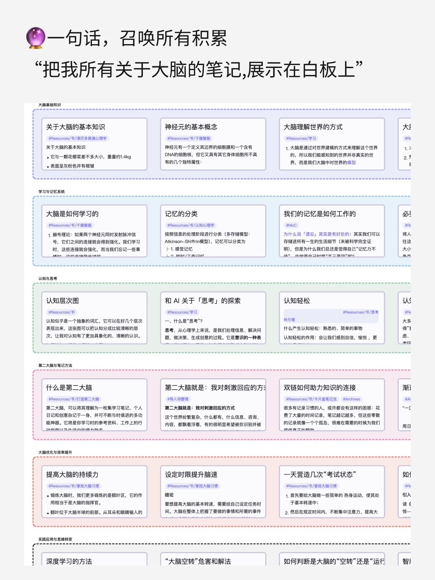 你只需要问它一句话:「把我所有关于大脑的笔记,展示在白板上。」