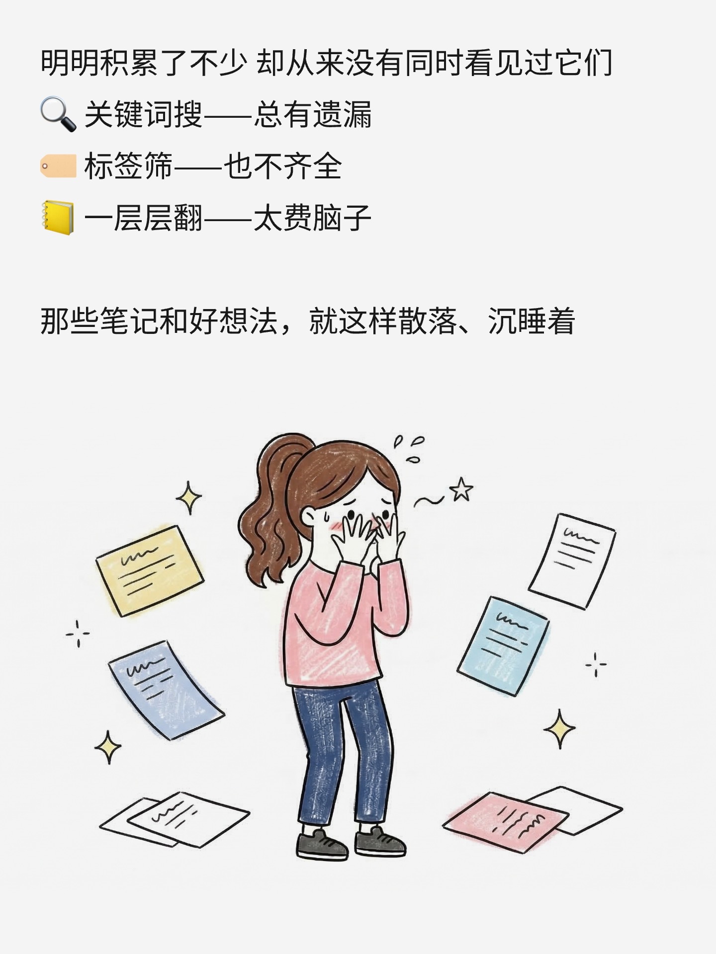 于是你试着去找。用关键词搜,总有遗漏;用标签筛,也不齐全;一层层翻笔记,太费时间,也太费脑子。这种感觉就像明明知道家里有宝贝,却怎么也找不全。