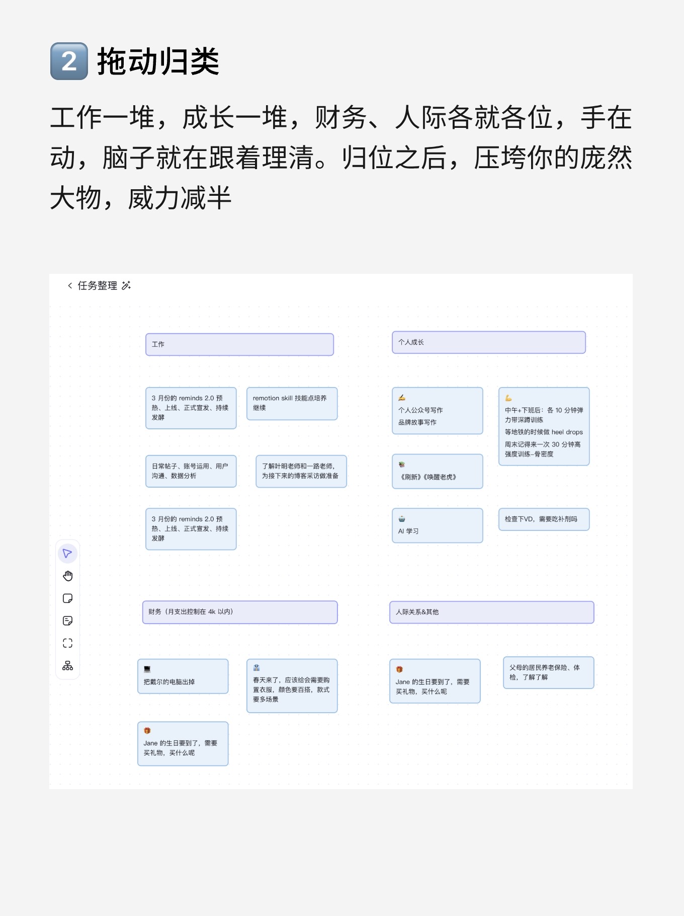 只需要一句话,那些沉睡在角落里的想法,就会一个个浮现出来,整整齐齐地站在你面前。积累得越多,能召唤出来的就越多。