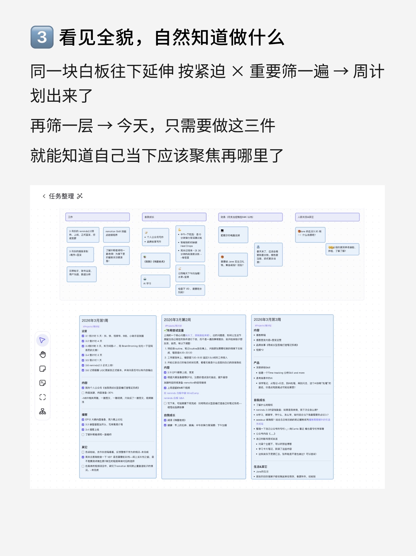 第一种,先看原貌。让笔记就这样铺开。散的、乱的、跳跃的...那是你最真实的思考轨迹。慢慢逛,重新发现那些被自己遗忘的细节。有时候,那些看似无关的碎片,反而能让你看到思考的演变过程。