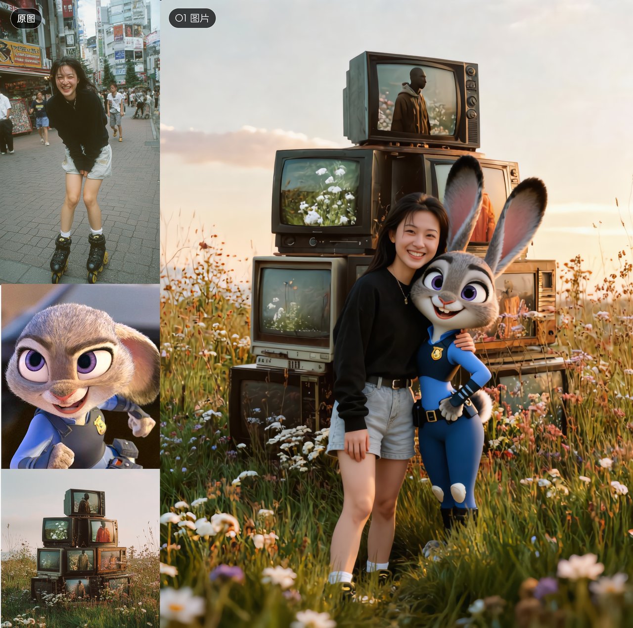 搞一下最近很火的跟朱迪合影,这个其实相对复杂点,涉及到场景一致性、而且人物和动画角色风格不太一样。
