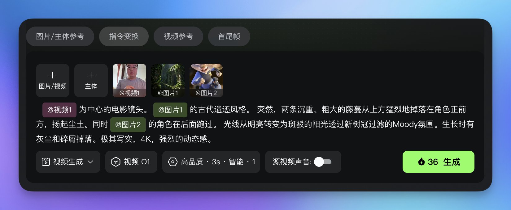 4. 自由组合参考与指令,覆盖运镜、动作、镜头延展等复杂玩法。