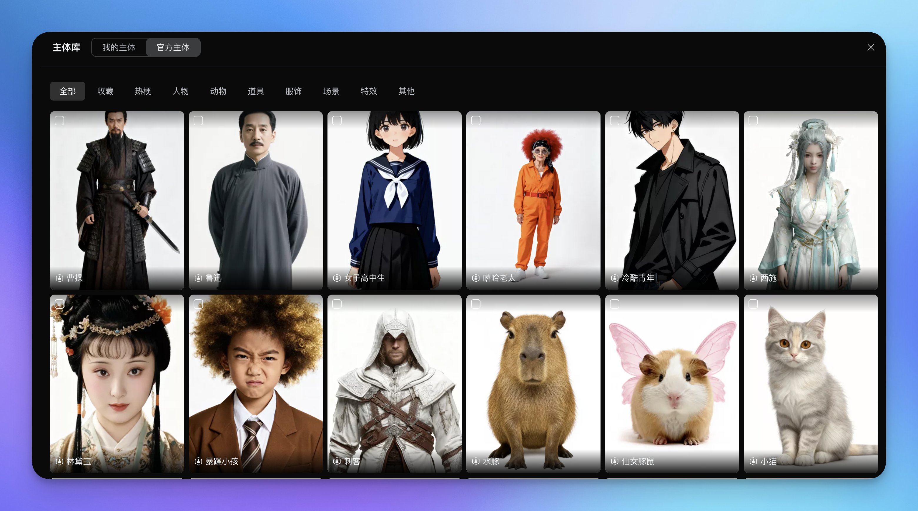 点击添加主体的图标右侧就会出现主体的选择弹窗,官方内置了很多常见的主体类似可以选择。