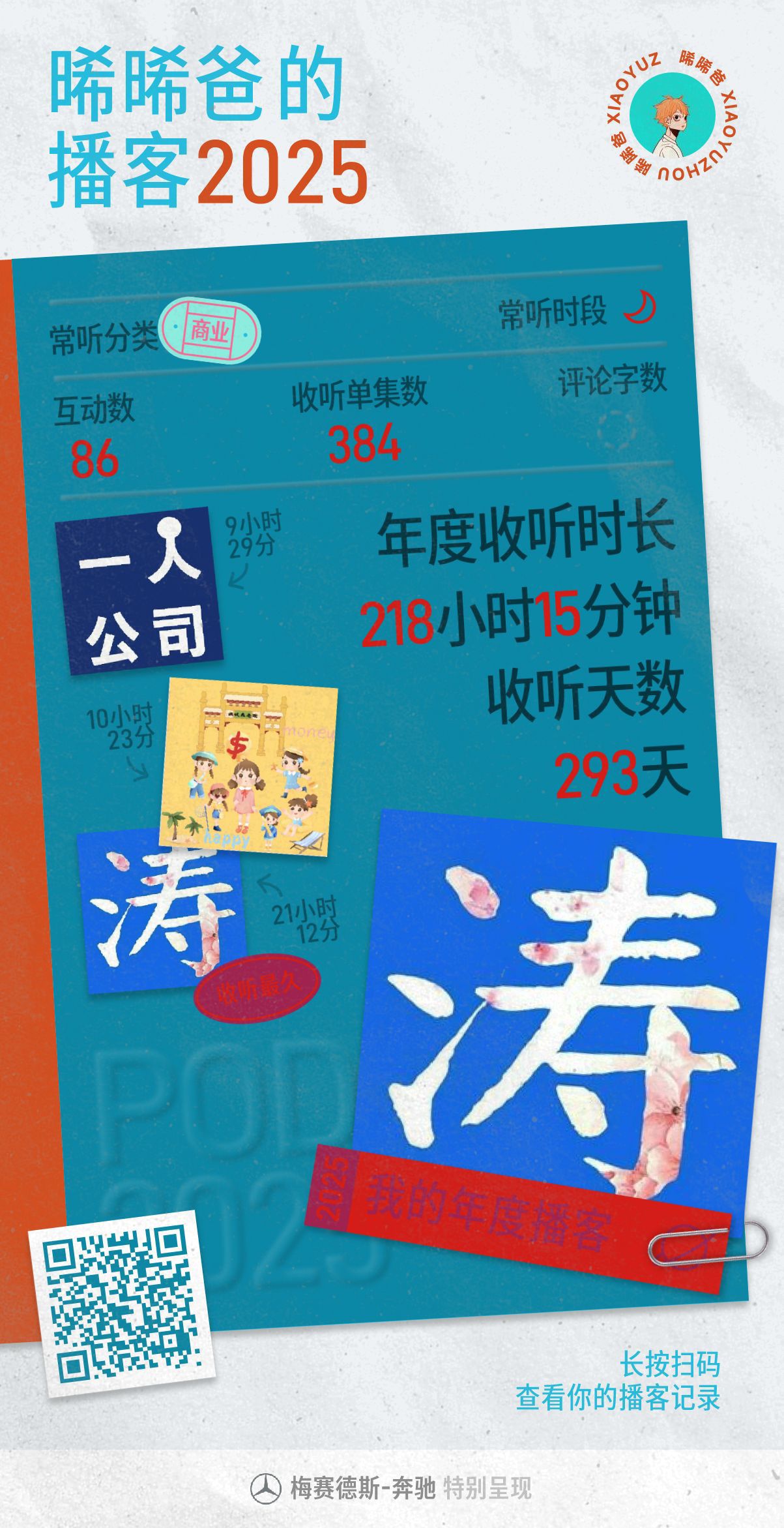 2、播客2025年总计在线293天,收听了384篇内容,时长大概在218小时;