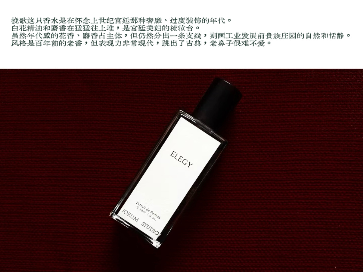 挽歌其实是一支馥奇调的香水,经典复杂的结构,花香、草本、木香、泥土香相互交织,最后却回归到如婴儿体香般令人安心的粉感/皂感味道——而这个味道是我一见钟情的开始。有一位香水博主对于这支香说得极妙:「挽歌是在怀念上世纪宫廷那种奢靡、过度装饰的年代,白花精油和麝香在猛猛往上堆,是宫廷美妇的梳妆台。虽然年代感的花香、麝香占主体,但仍然分出一条支线,刻画工业发展前贵族庄园的自然和恬静。风格是百年前的老香,但表现力非常现代,跳出了古典,老鼻子很难不爱。」
