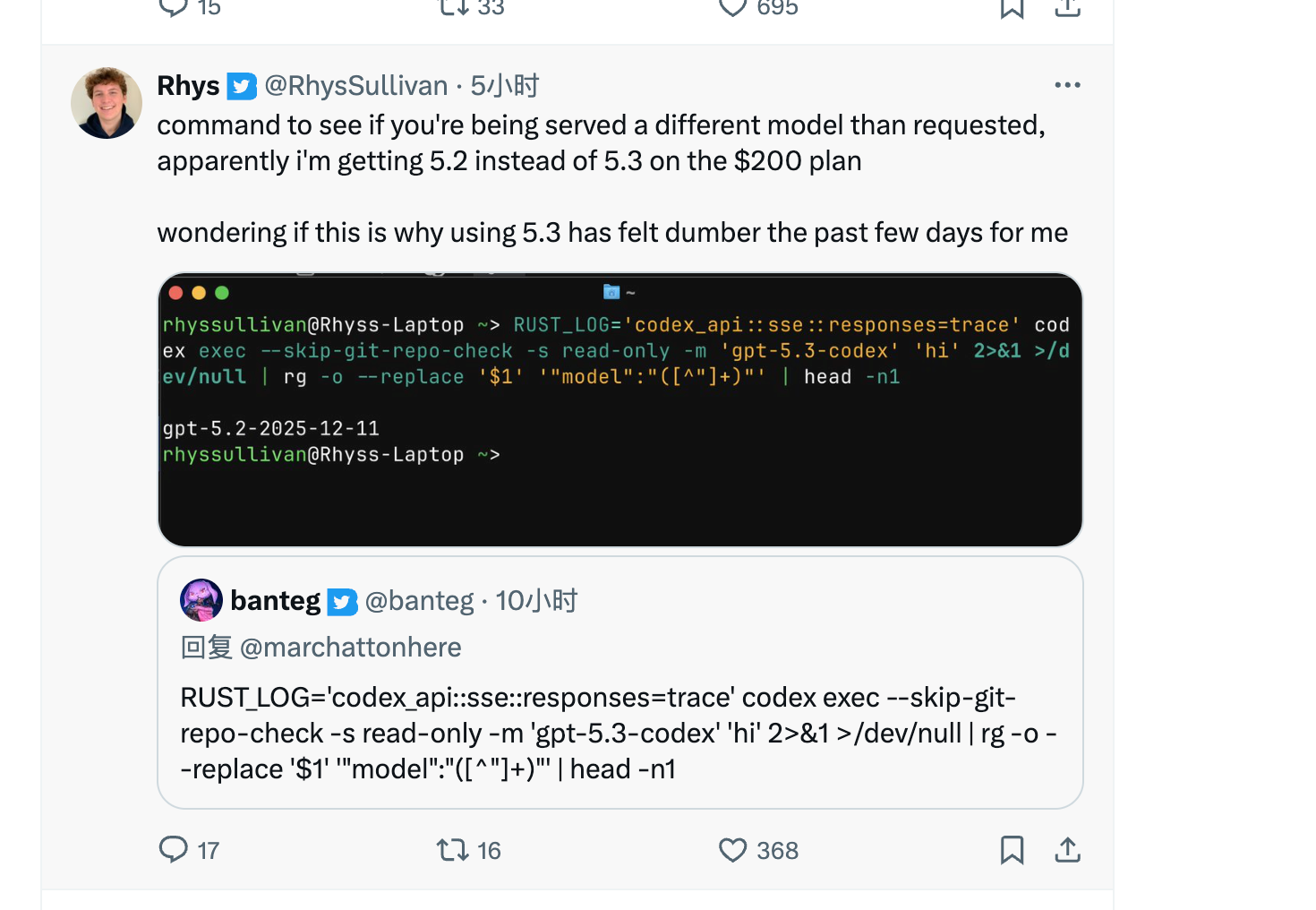 它会毫不声色地把用户(虽然表面上用的是 GPT-5.3-Codex)其实返回的是 GPT-5.2。你来看一看你是不是中招了,用这个命令就可以看。
