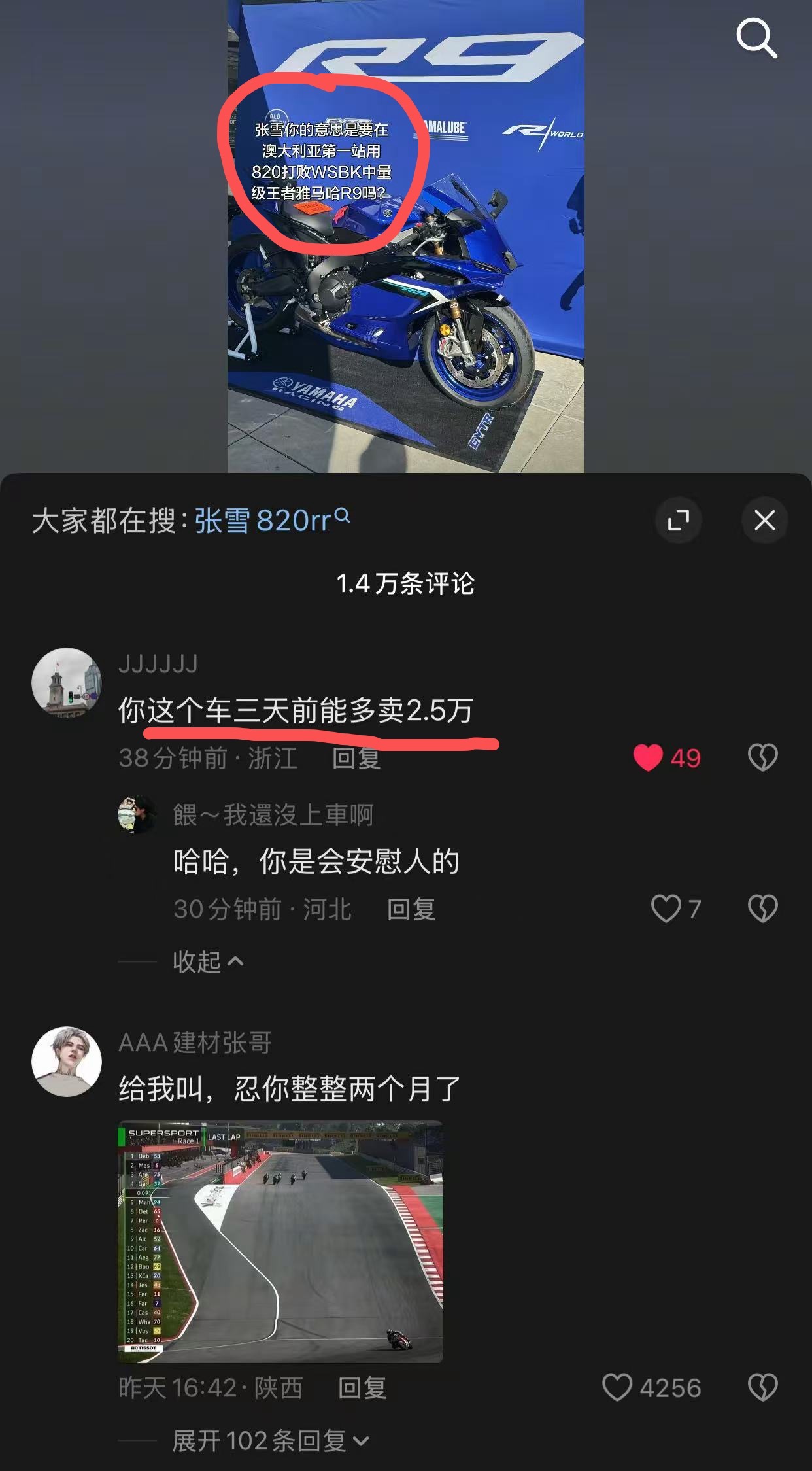 一个网友1月份质疑张雪机车,3月份就被其他网友“安慰”了。