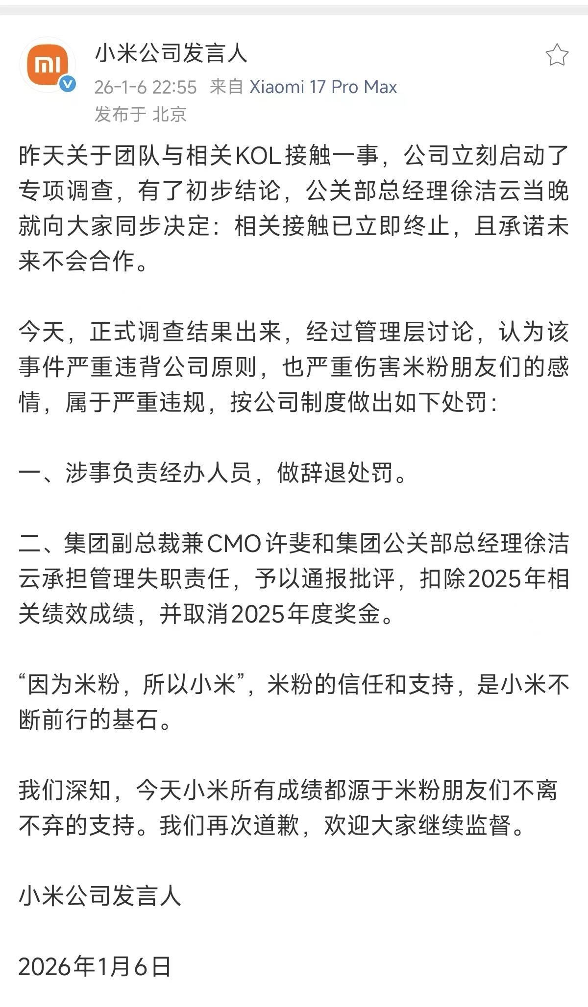 CEO来信: 小米公司对某KOL事件的处罚结果。