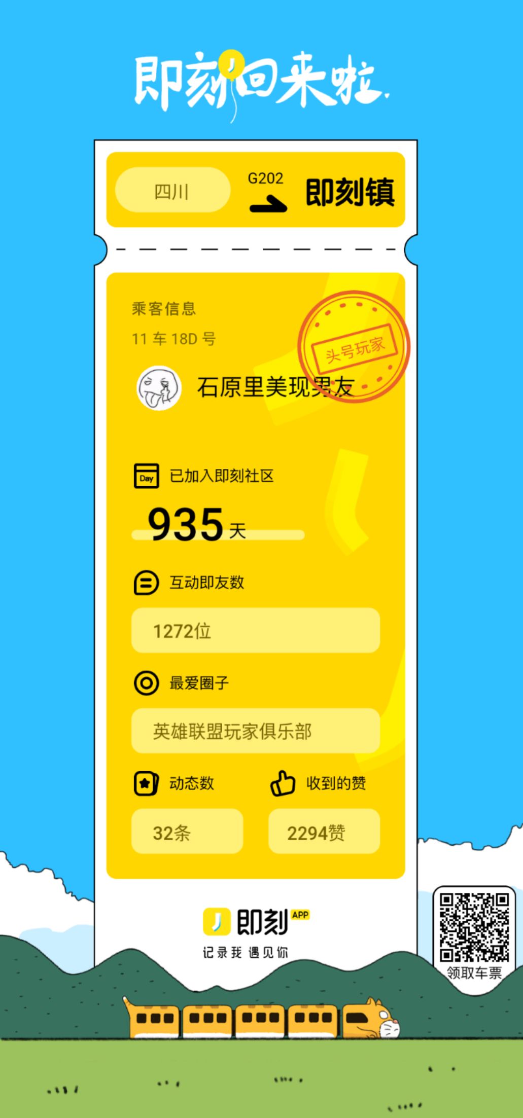 即刻编辑: 即刻App回来啦!回归号列车将开往即刻镇,车票上写满了你的即刻记忆。快来领取车票上车吧 👉https://h5.okjike.com/jike-is-back?displayHeader=false&displayFooter=false 不过,还有不少即友不知道回归喜讯,把你的车票发往各处,比如朋友圈、微信群、微博,帮更多即友回来吧! 往后的日子里,继续记录我,遇见你。