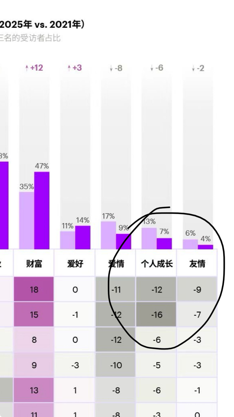 阑夕ོ: 年轻人远离「爱情」,中年人调低「事业」,老年人放弃「家庭」。 00后对于「健康」的重视度增长比其他年龄段都要高。 「财富」是唯一一个在所有年龄段都有重视度增加的选项。 「爱好」的消费增加似乎主要依靠50岁以上的中老年人带动。 绝大多数年龄段都降低了对于「个人成长」的追求,唯一的例外是60岁-65岁的老年人,只有他们还在提高自身成长的预期。😅