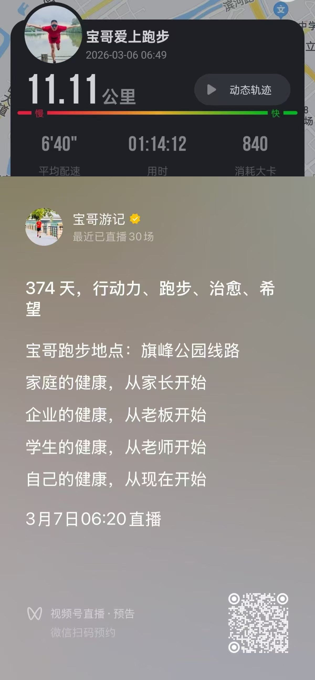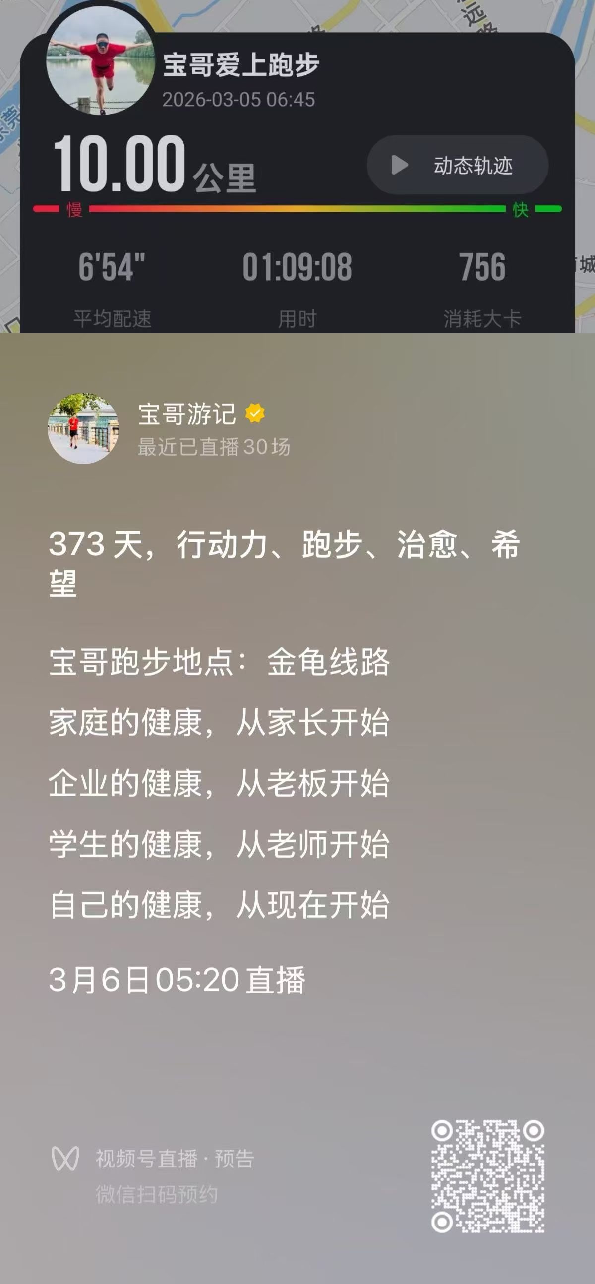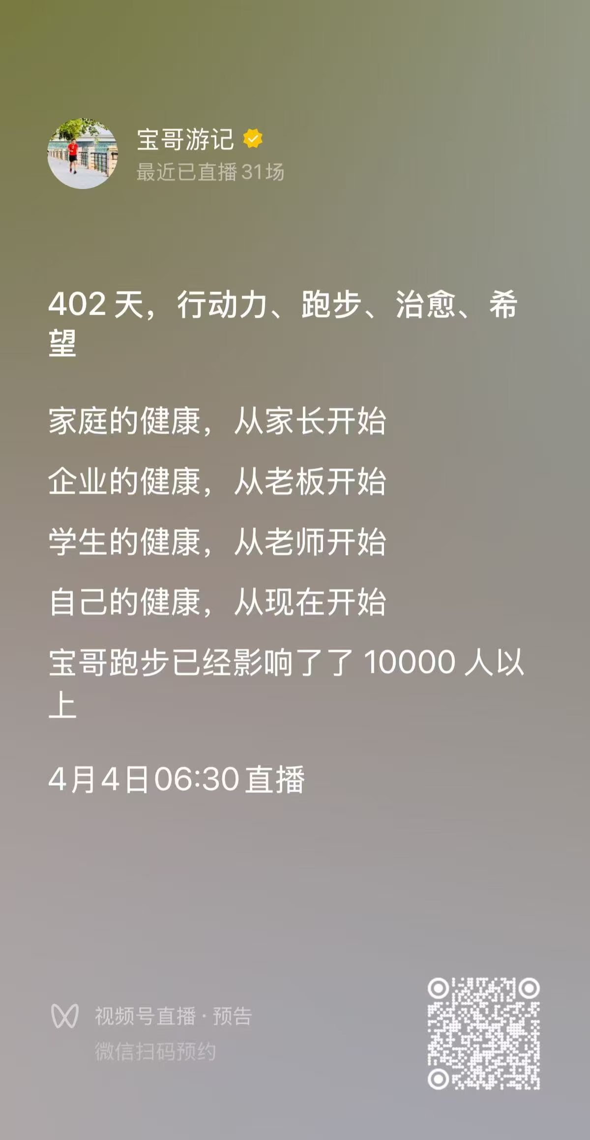 今天是2026年4月3日,宝哥跑步直播第401天。早上空气清新,气温23度,今天跟群里的旷总、应总、孔总一起跑,快跑完了,又偶遇到张总,整个人状态很舒服。今天完成跑步13.14公里,平均配速603,平均心率138。回来之后继续做了俯卧撑22个、臂力器22下、平板撑1分05秒、靠墙蹲1分05秒。