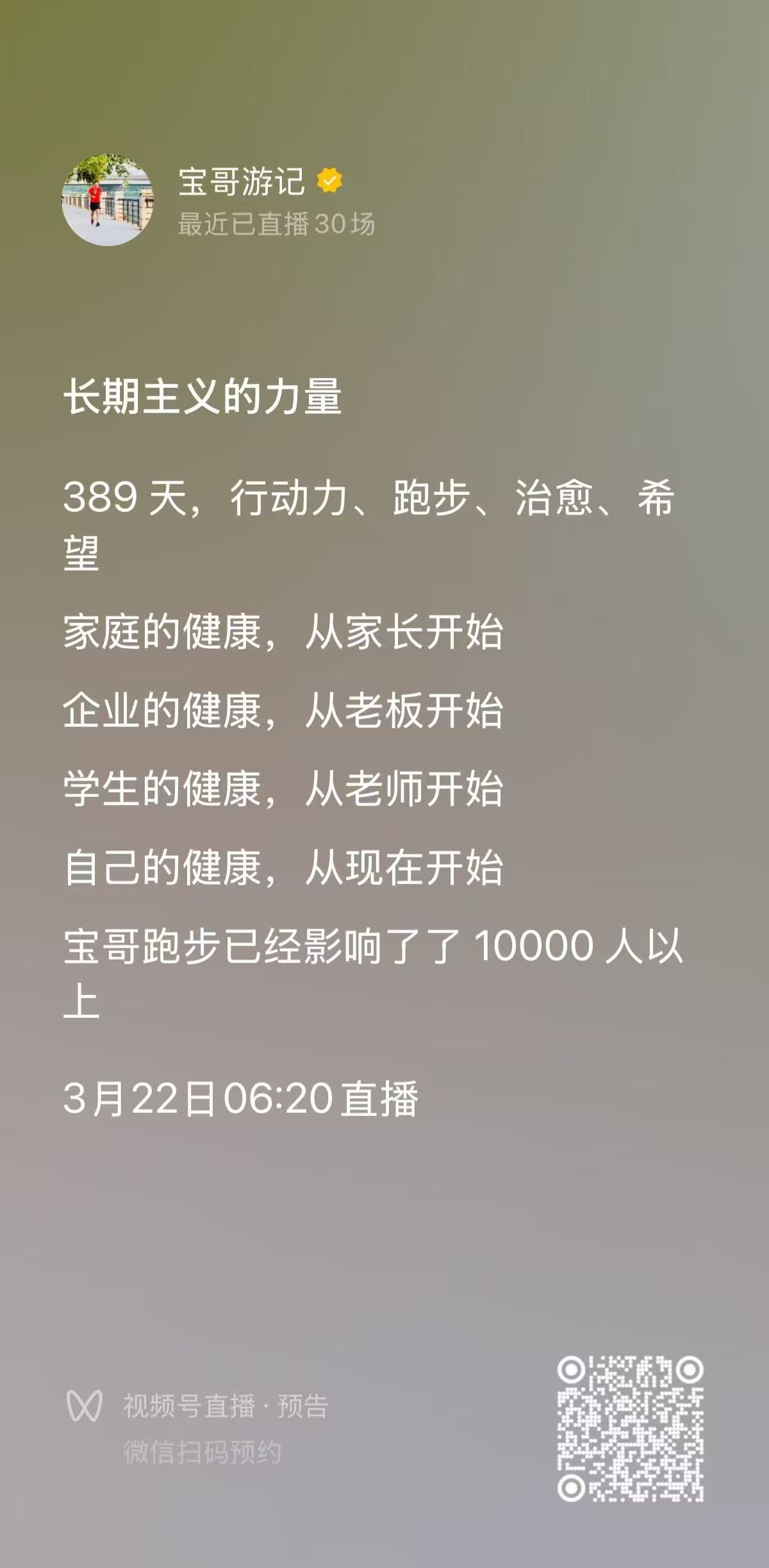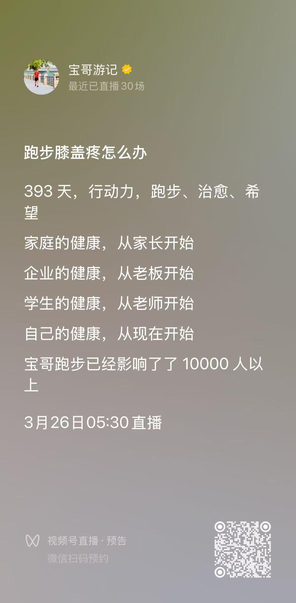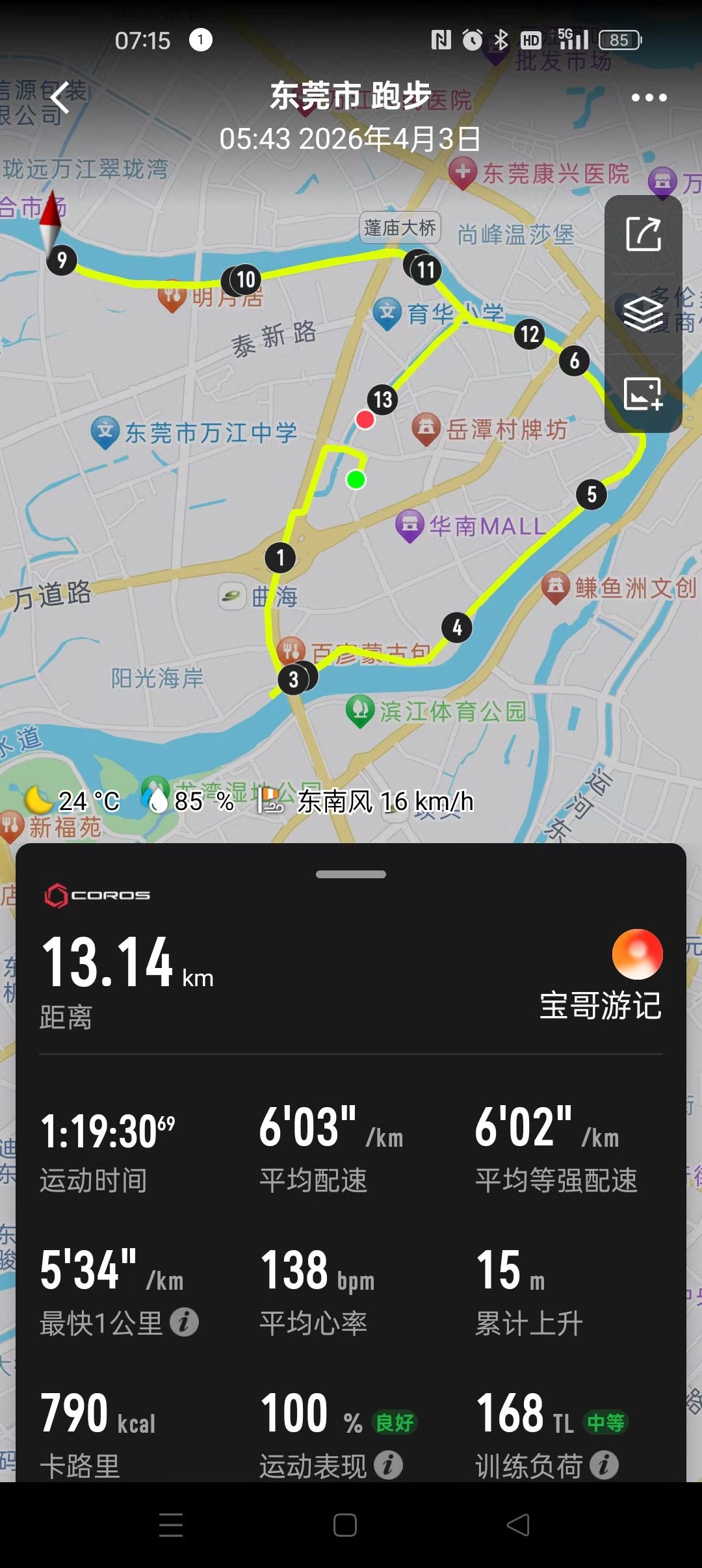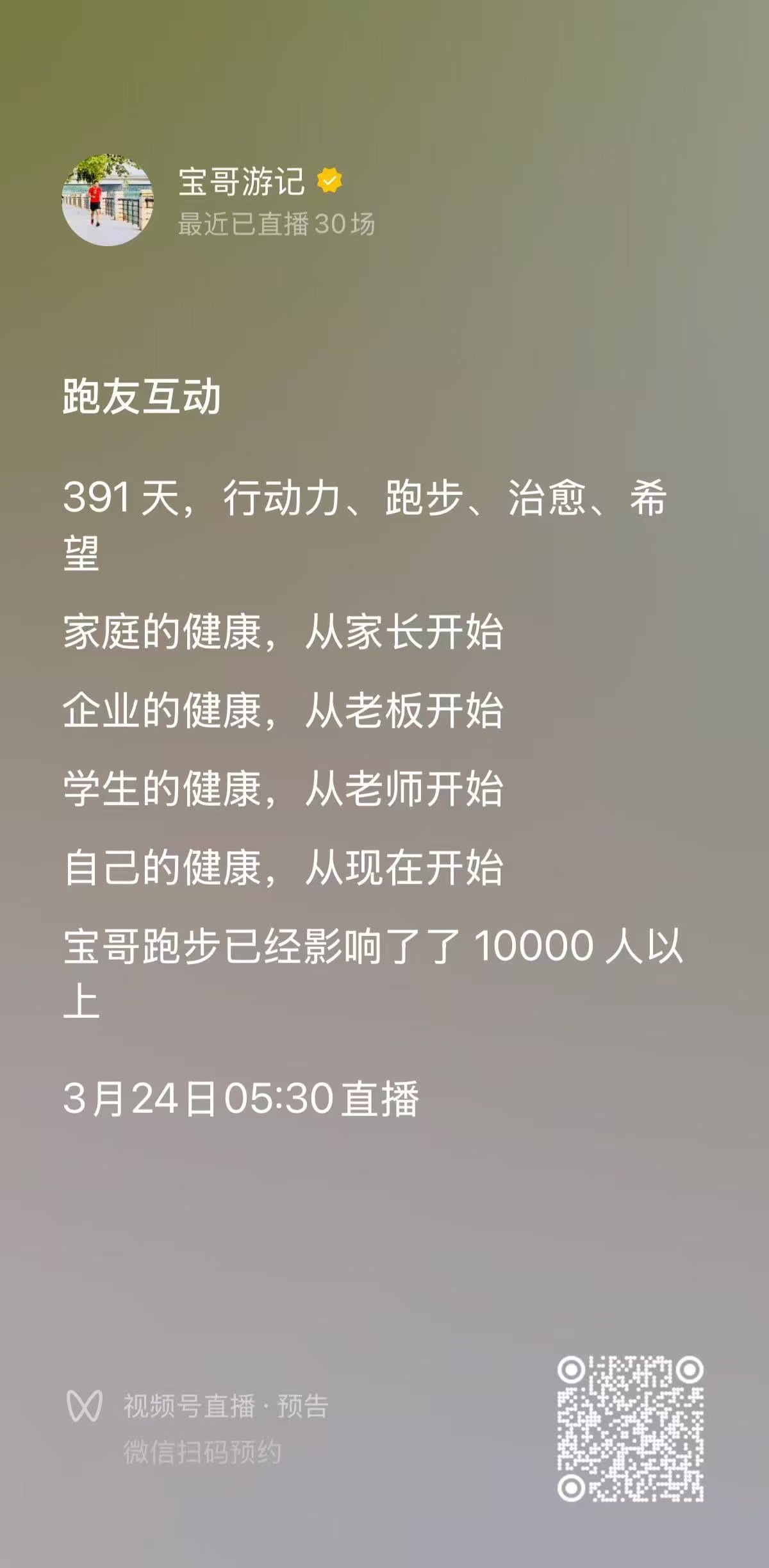 今天是2026年4月3日,宝哥跑步直播第401天。早上空气清新,气温23度,今天跟群里的旷总、应总、孔总一起跑,快跑完了,又偶遇到张总,整个人状态很舒服。今天完成跑步13.14公里,平均配速603,平均心率138。回来之后继续做了俯卧撑22个、臂力器22下、平板撑1分05秒、靠墙蹲1分05秒。