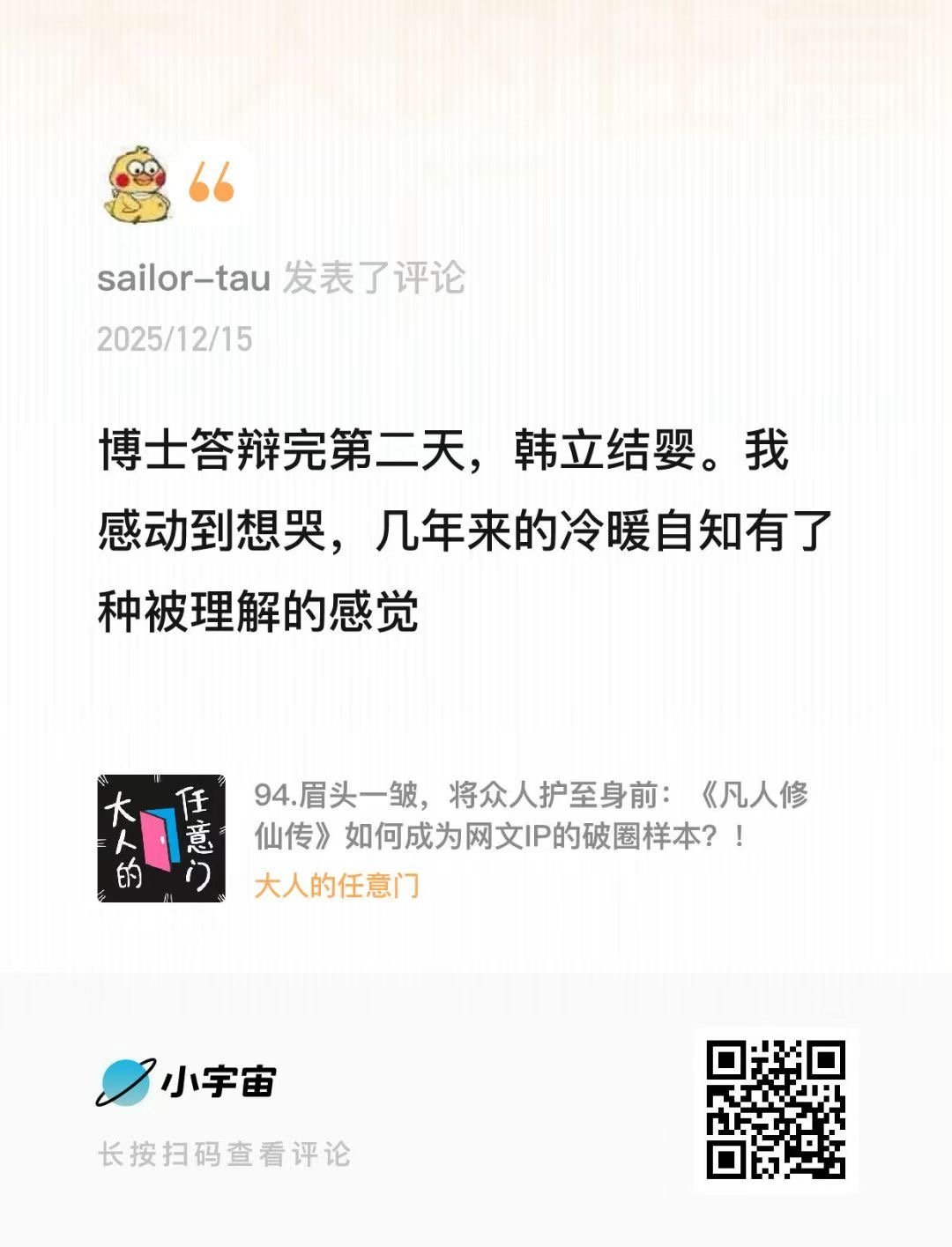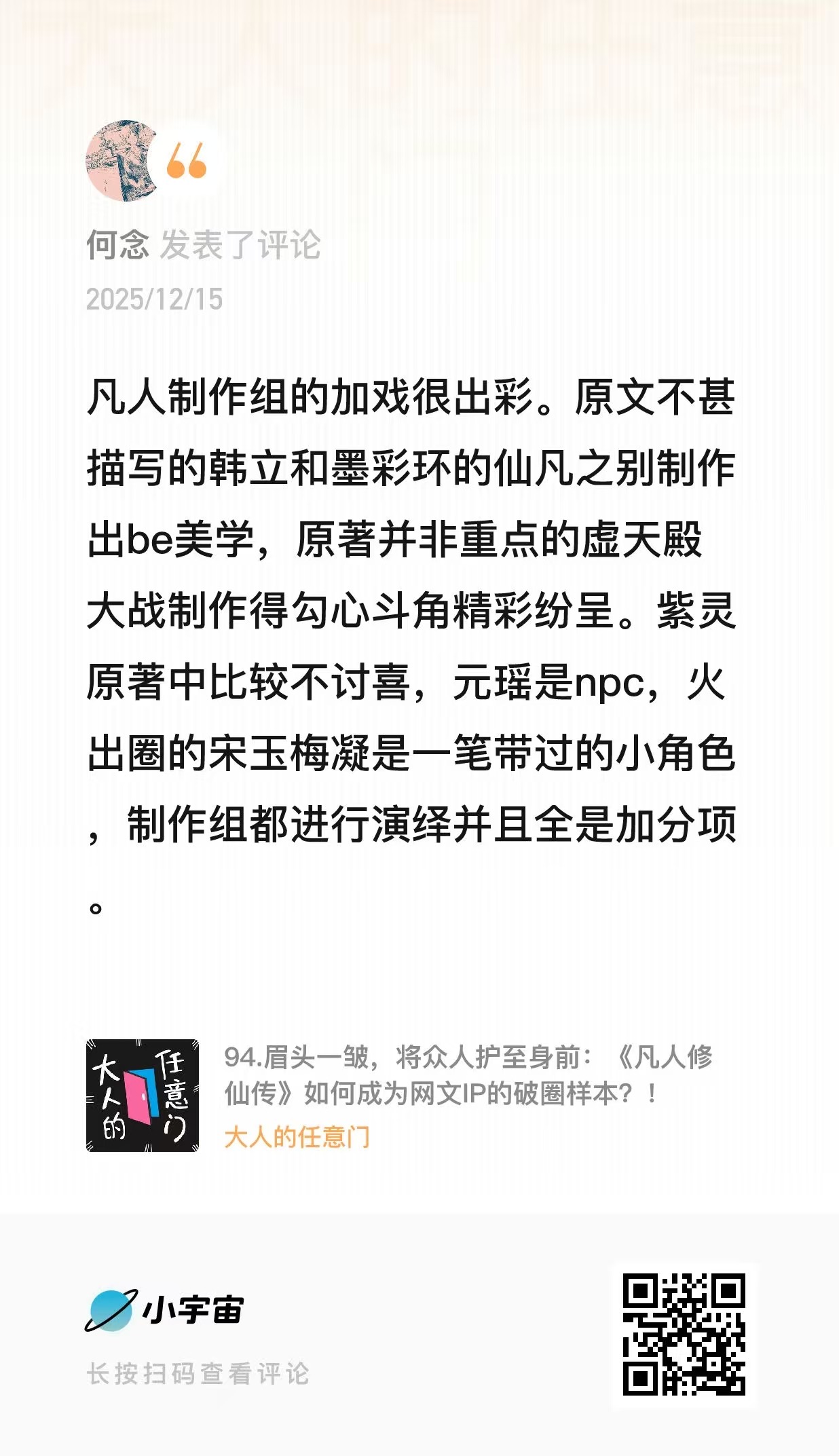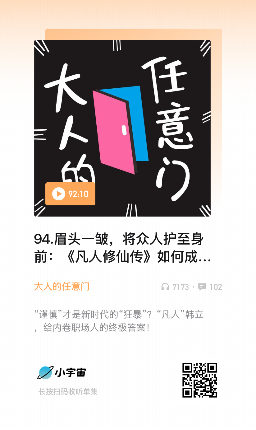 从 2008 到 2025,从起点爽文到破圈动画。《凡人修仙传》能把B站整崩,因为“凡人”、“伪灵根”、“散修”终成元婴。大时代下,人人皆有立场,如果说韩立是职场人的“修仙”指路人,《凡人修仙传》本身就是一个IP的"延迟满足"的故事。