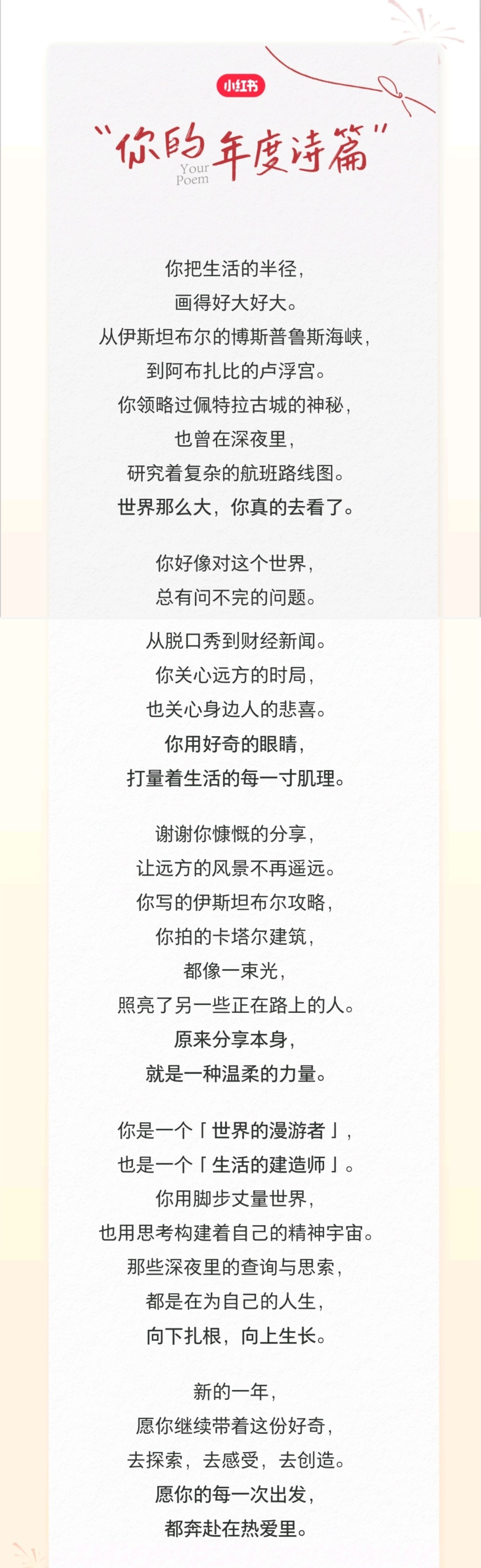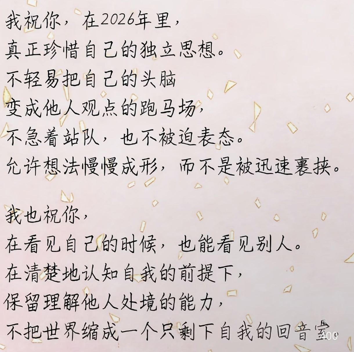 “记得在南京大学读书的时候,有一位很酷的黑人女老师,她是教我们黑人文学的老师,她叫Donald。她第一天走进我们的教室,就在黑板上写了几句话,那是我从来没听过的话,也是至今对我震撼最大的一番话。今天,我也想把她说过的话送给你们:“You are unique. You are a marvel. In the past five hundred years, there has been no person like you; And in the next five hundred years, there will be no person like you.”