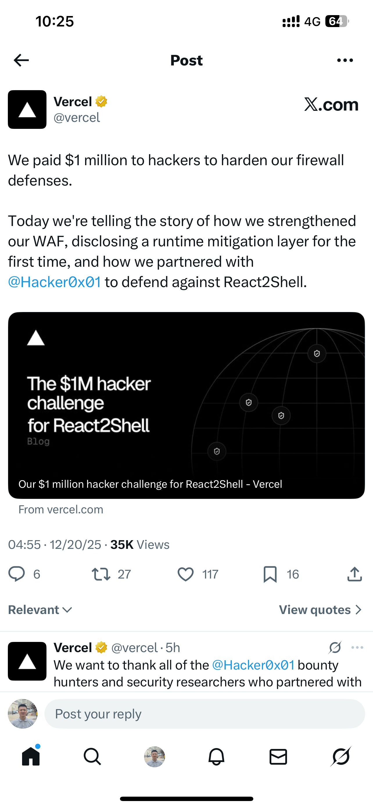 而且cve漏洞对Vercel商业化影响很大,所以肯定会被重视并逐步修复。这不,Vercel发布了百万悬赏寻找漏洞的英雄帖。