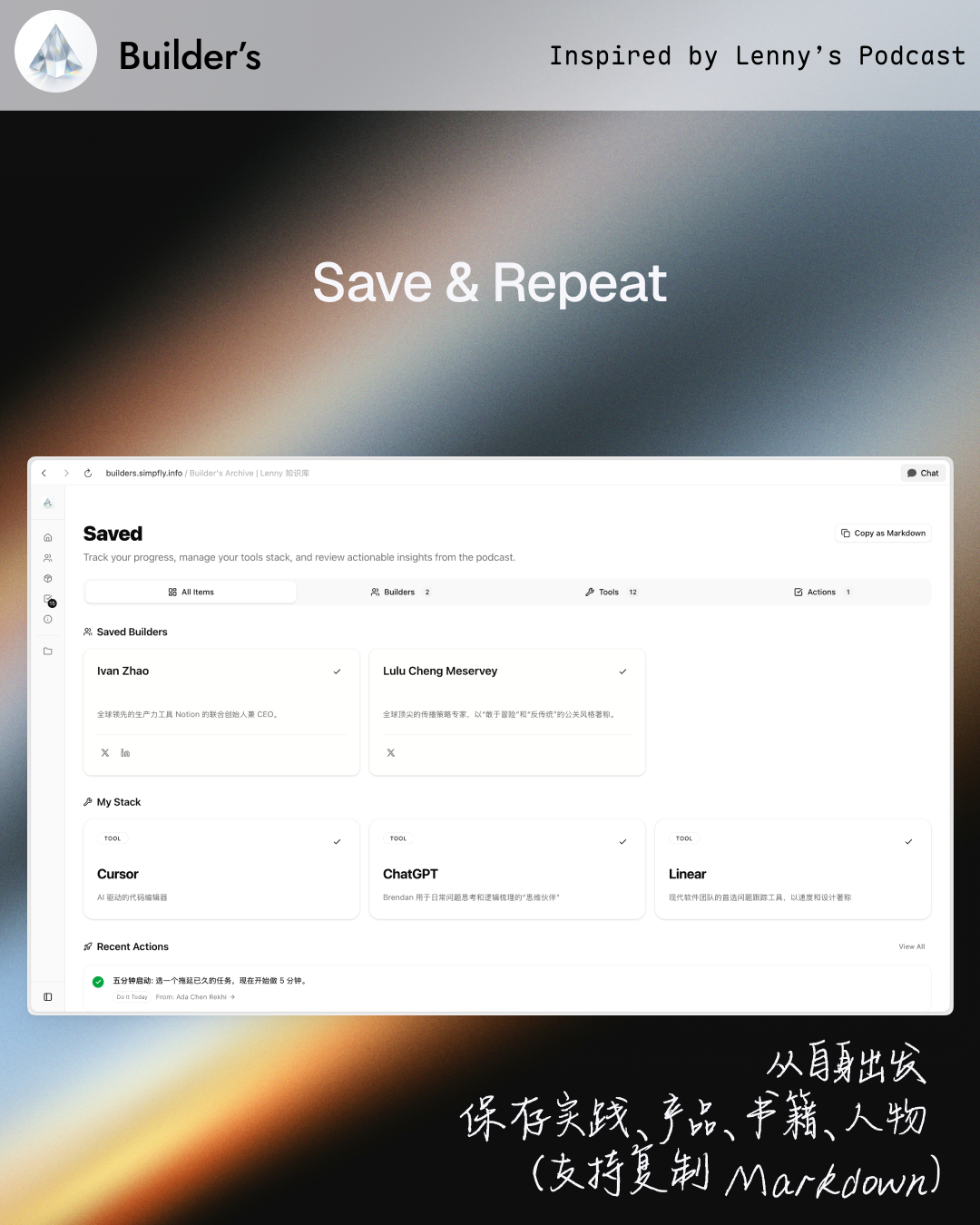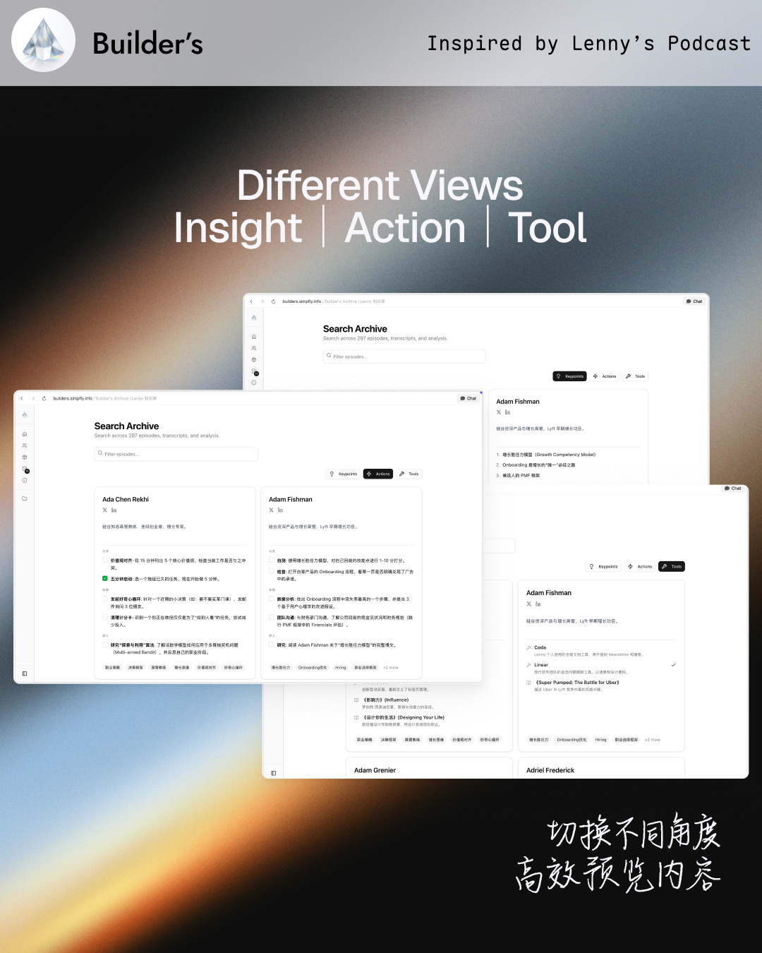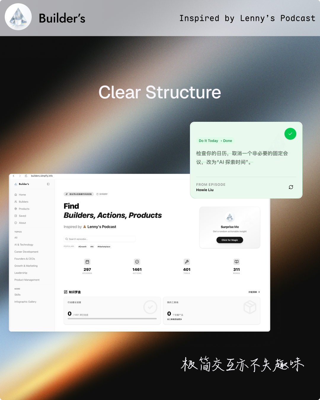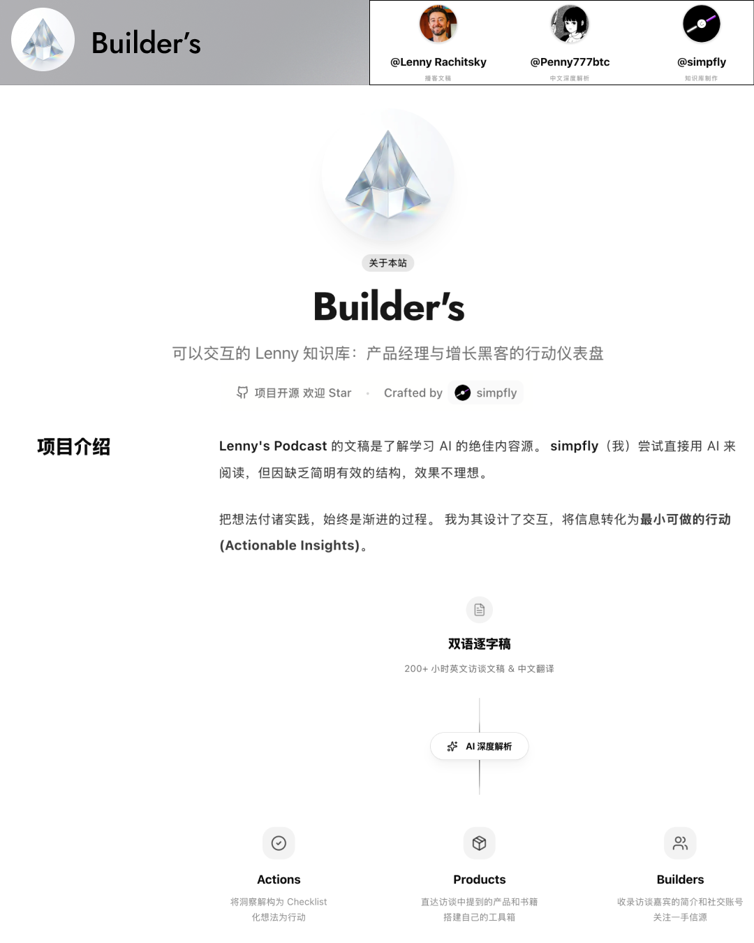 Curiosita: 我花 3 天时间把 Lenny 公开的播客文稿做成了可交互的网站 Builder's https://builders.simpfly.info/ 顾名思义,它是属于建造者的。 废寝忘食做这个网站,不是为了当信息搬运工。 Lenny's Podcast 的文稿是了解学习 AI 的绝佳内容源。 我尝试直接用 AI 来阅读,但因缺乏简明有效的结构,效果不理想。 把想法付诸实践,始终是渐进的过程。 我为其设计了交互,将信息转化为最小可做的行动 (Actionable Insights)