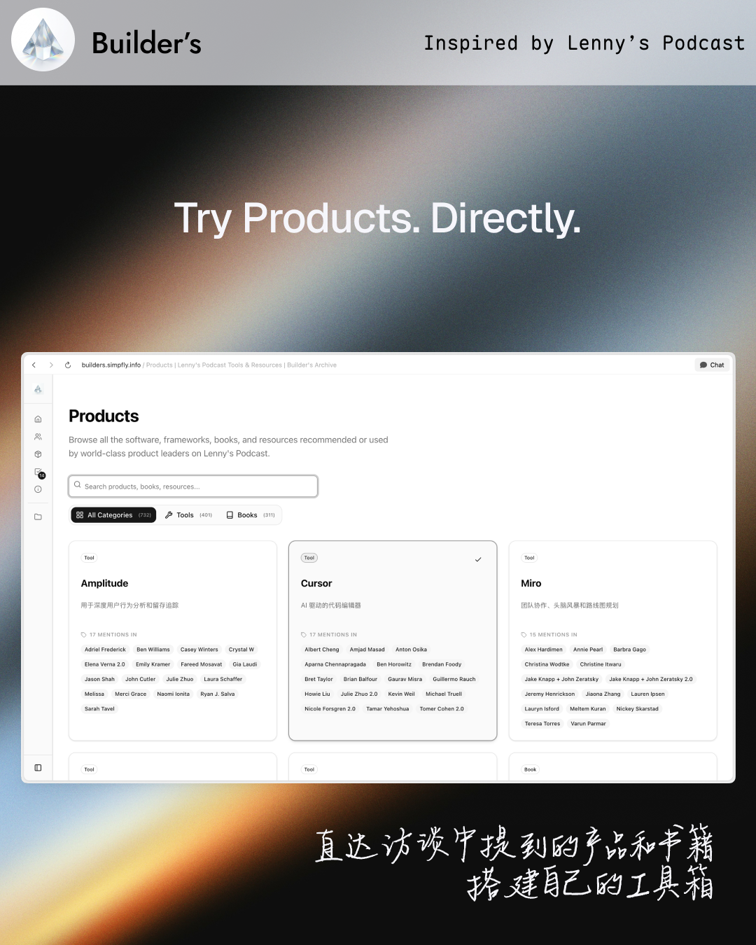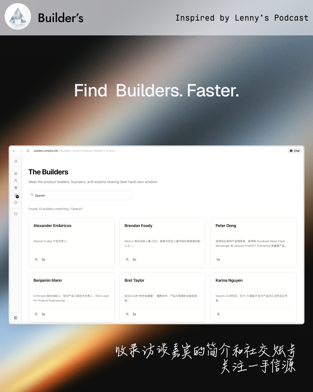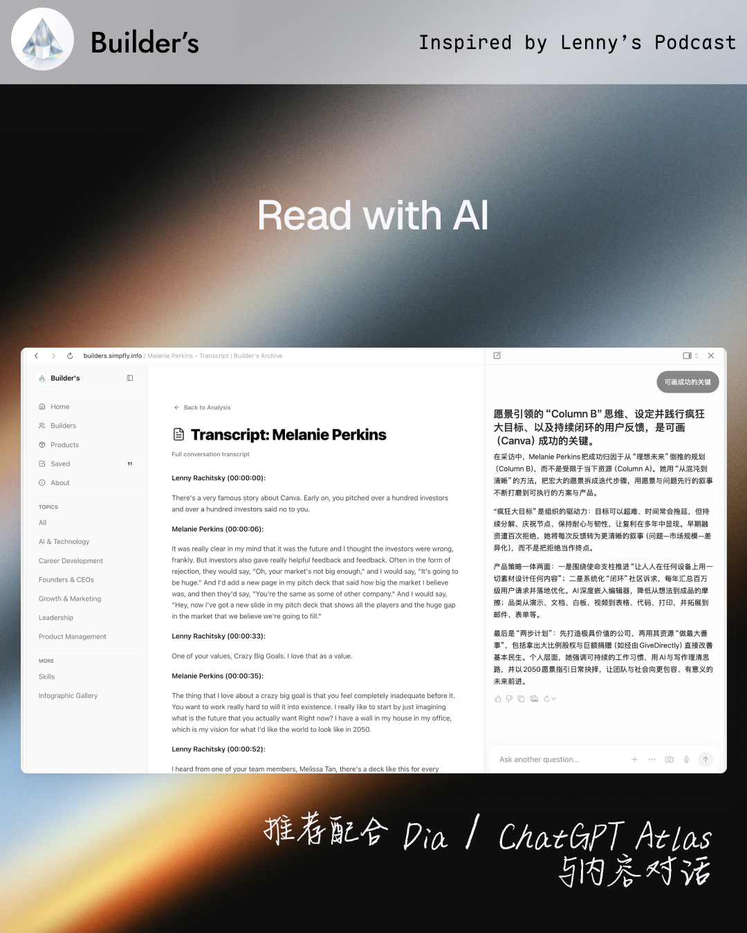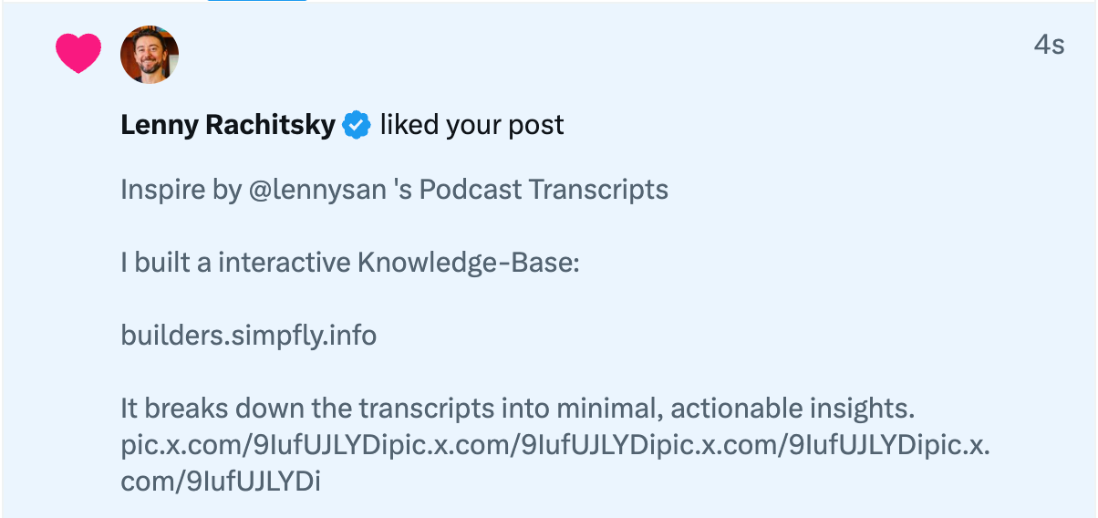Curiosita: 我花 3 天时间把 Lenny 公开的播客文稿做成了可交互的网站 Builder's https://builders.simpfly.info/ 顾名思义,它是属于建造者的。 废寝忘食做这个网站,不是为了当信息搬运工。 Lenny's Podcast 的文稿是了解学习 AI 的绝佳内容源。 我尝试直接用 AI 来阅读,但因缺乏简明有效的结构,效果不理想。 把想法付诸实践,始终是渐进的过程。 我为其设计了交互,将信息转化为最小可做的行动 (Actionable Insights)
