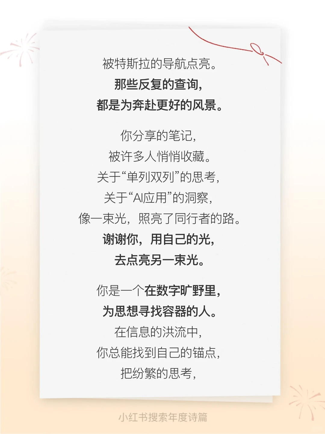 小红书的《你的年度诗篇》不提问,它替你回答。它不指向未来,而是回头看。它翻你的搜索记录、你的笔记、你的收藏和点赞,然后告诉你:你已经活成了一首诗,只是你自己没注意到。