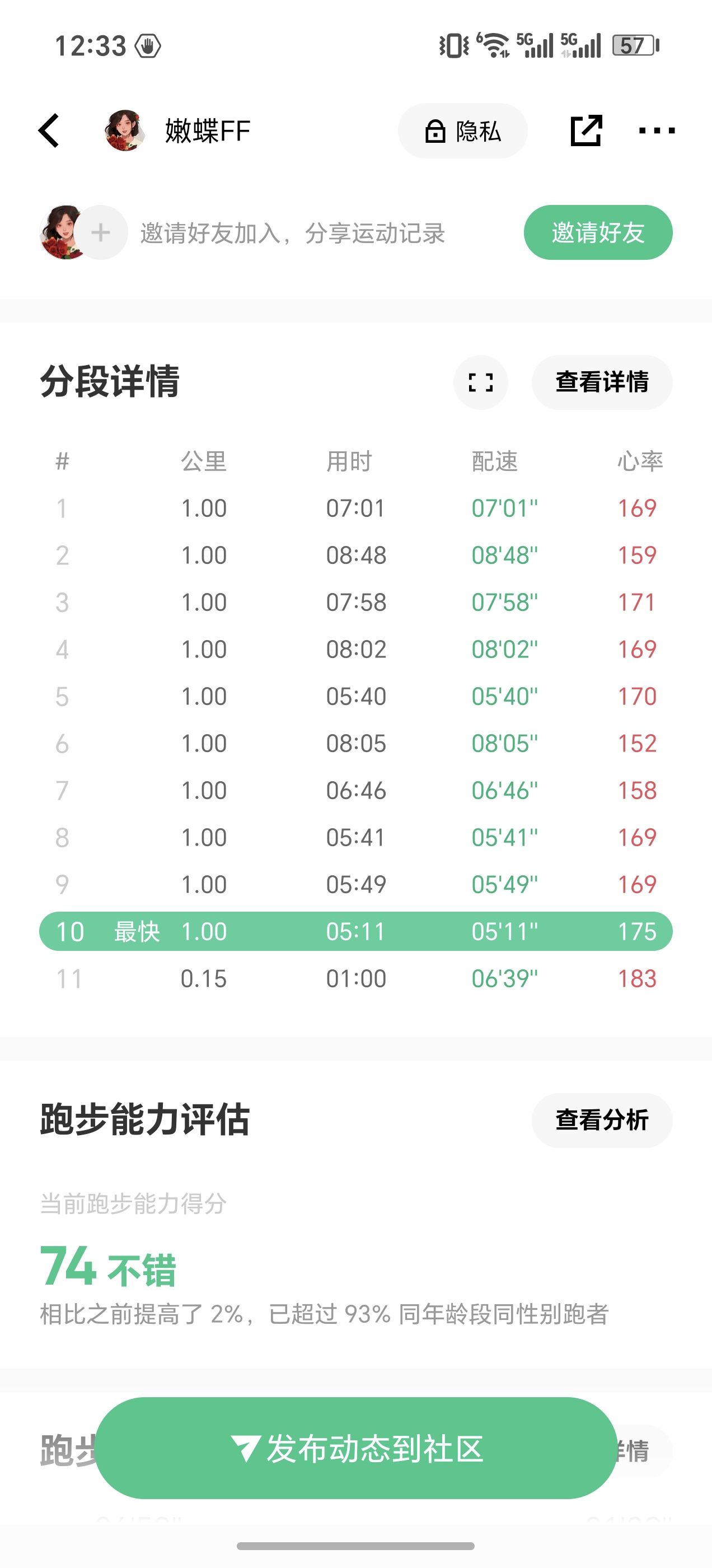最近几次训练状态都不太行。今天前五公里简直要命,感觉自己废了,跑的好累最后一公里8分多钟。到第五公里的时候差点准备回家了,但是又不太甘心走了几步开始选择摆烂跑,用很小的步子慢慢溜,居然溜着溜着溜快起来了,轻松的达到5分多一公里…最后完成今天的任务。