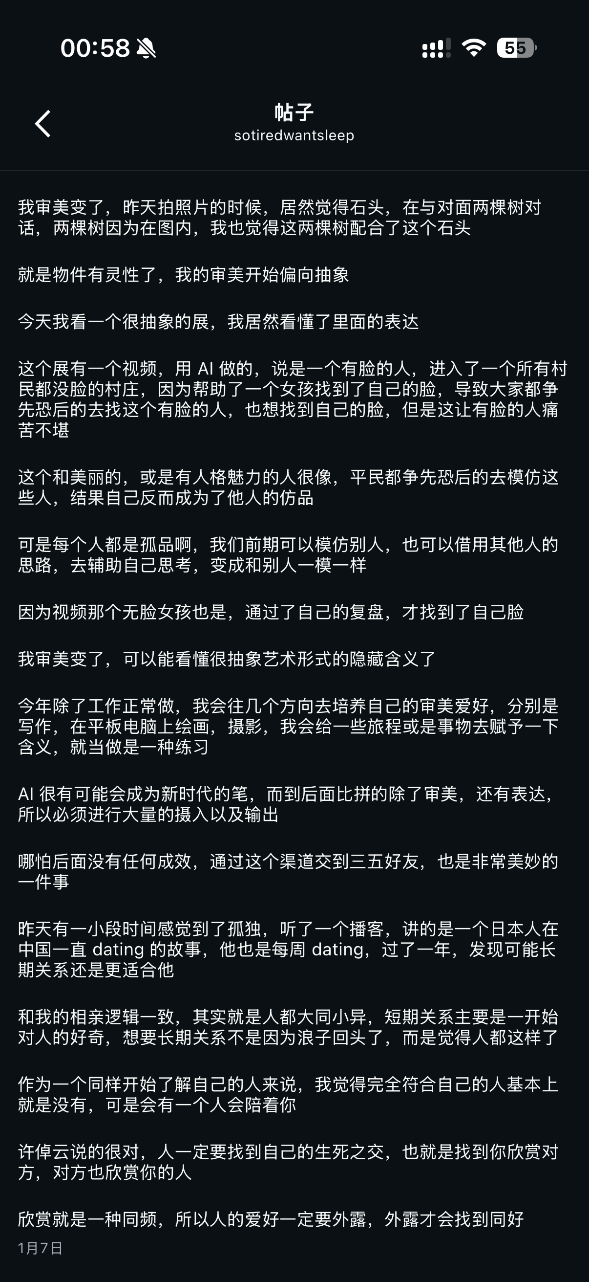 m.okjike.com)里第一段是替换了,原主题如下图,在工作中经历过名利场的高光,对世俗定义成功暂时失望,目前花期主要在生活中,暂时还俗下山,最近就是不断接触新朋友,想看看有没有什么新观点和视角