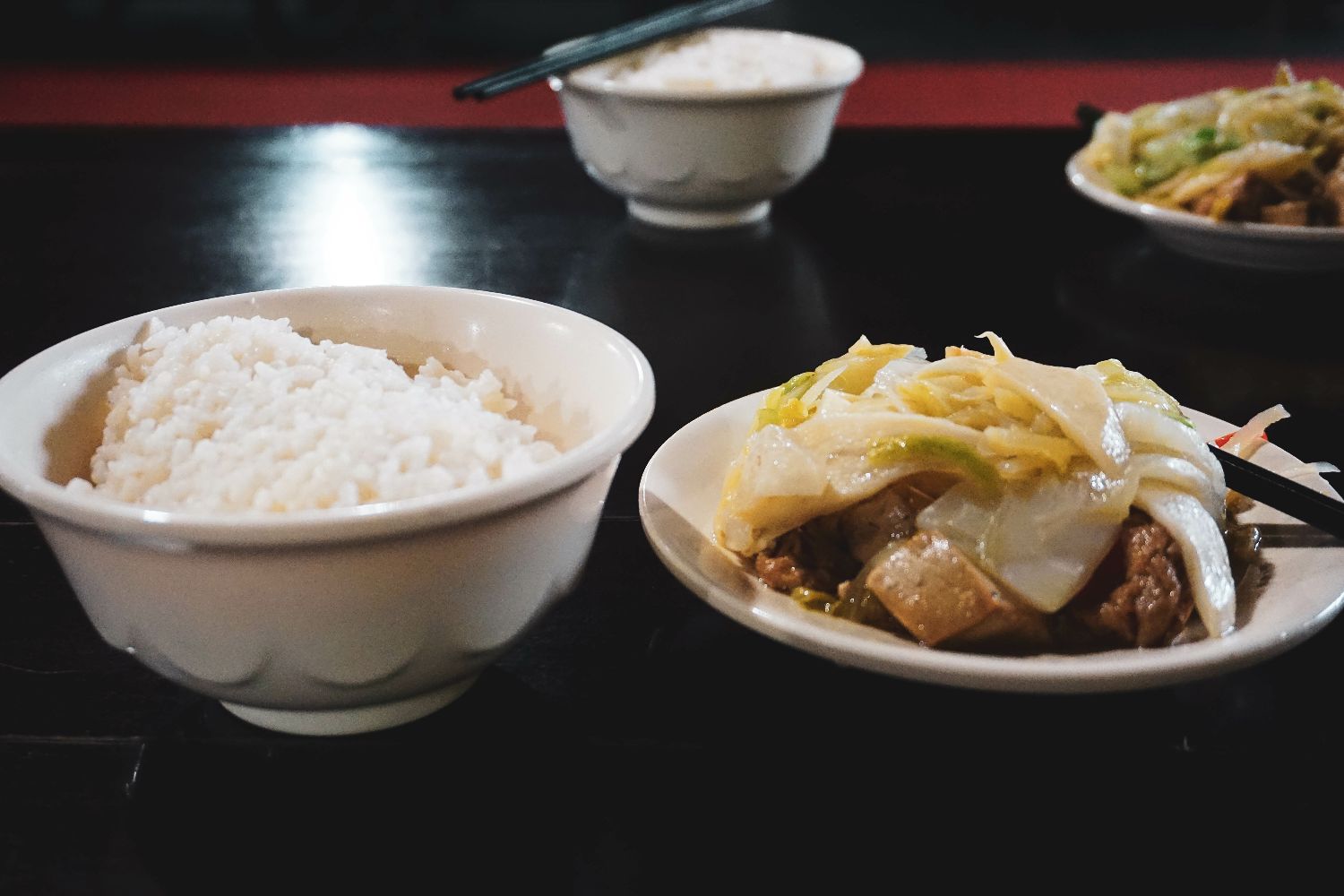 4.饭菜都是一人一碗饭和一碟杂素菜(豆腐,白菜,藕片等等等),看起来份量不多,但还挺够吃的,而且吃完都是可以免费再加的,旁边也有小菜可以自取,另外一侧有自助的汤可以盛。