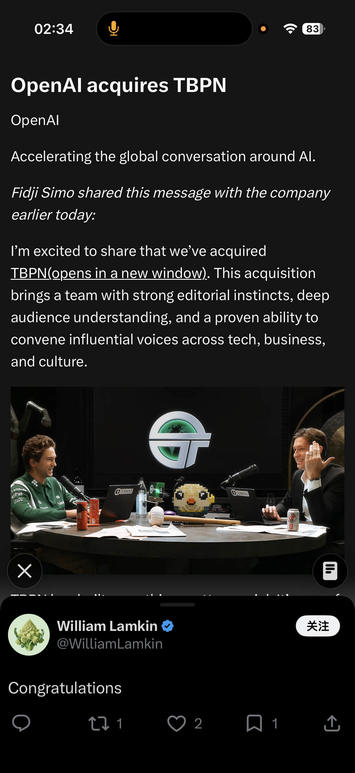 我很高兴和大家分享,我们已经收购了 TBPN。