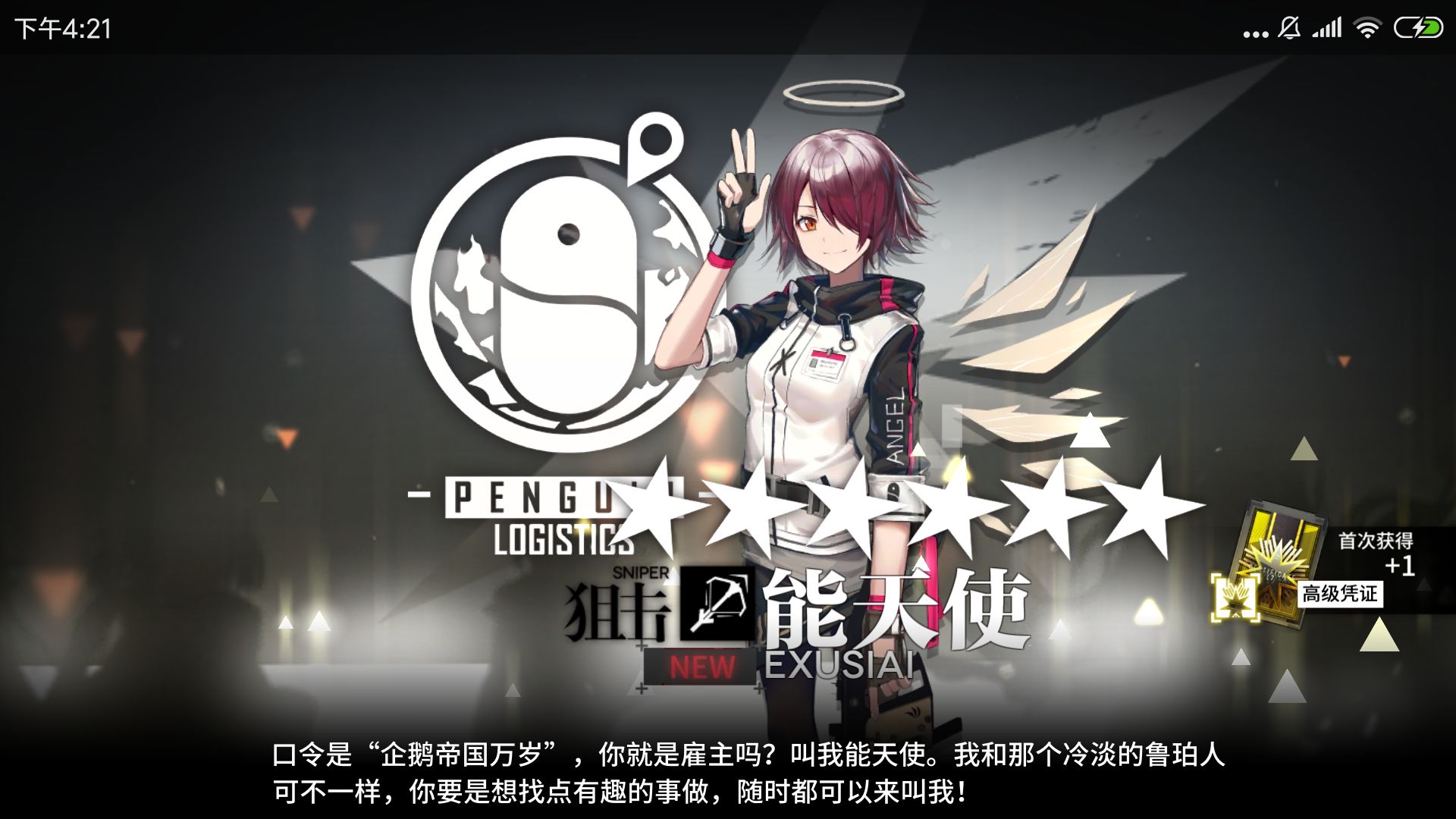 新鲜出炉的能天使,我终于偷渡成功了呜啊啊啊啊啊QWQ,噫呜呜噫QAQ,希望每位刀客塔都能招到美腻的阿能!