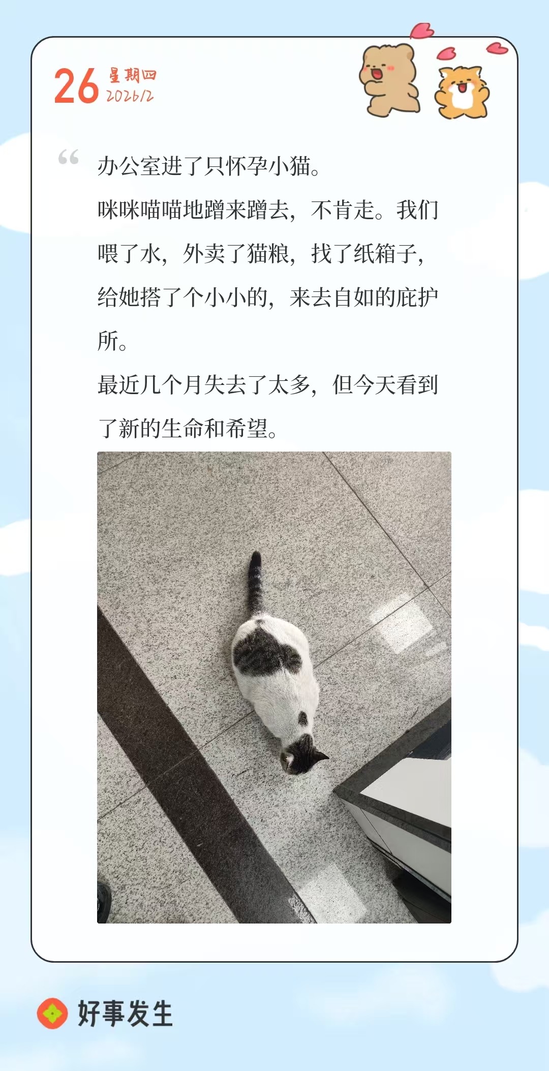 大家好,欢迎来到好事星球,我是好事发生App&行动响指App的官方账号,是你们的好朋友好事记录君。
