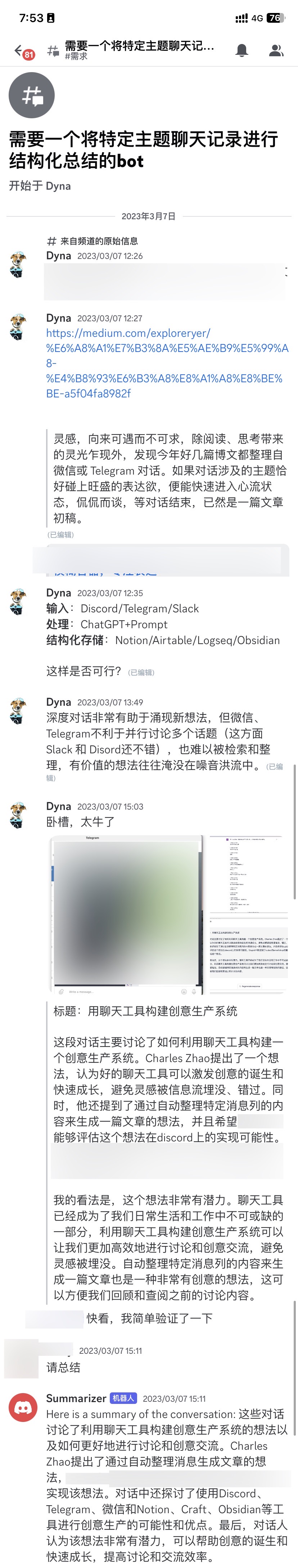 上周才在Discord 用ChatGPT API验证并实现了AI bot总结对话的功能