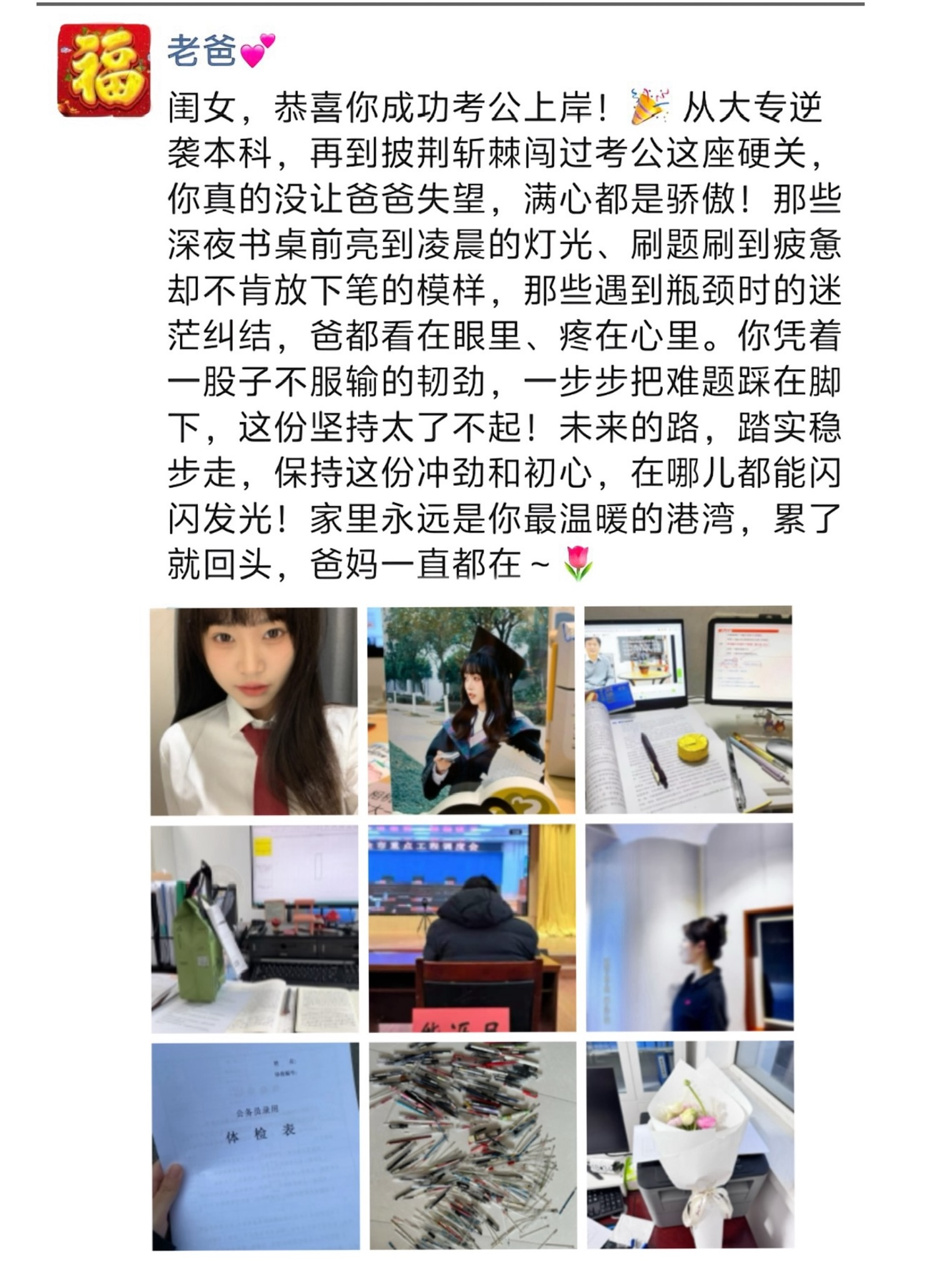 今天刷到一个视频让我深有感触,便也翻到了爸爸之前发的朋友圈,当初备考时爸爸一直在照顾着我的衣食住行,把我养的很好,全家人一直支持着我,但是压力还是巨大,虽然爸爸一直跟我说考不上也没事,但还是感觉很窒息,经常刷题刷到崩溃大哭,这个时候妈妈总会安慰我给我动力,才能让我有现在这样安稳的生活,还记得公示期的时候一家人小心翼翼的,生怕出什么幺蛾子,过去之后我发完朋友圈随后爸爸妈妈也发了,看见后突然没绷住,能走到现在一直以来都离不开爸爸妈妈的支持,没有他们就没有现在的我!你们养我长大我养你们到老,现在普遍找工作都不好干的,还是考公比较好一点,不然根本没啥出路,战胜惰性要把命运掌握在自己手里,可以分享给想端铁饭碗的未来各位局长们一些经验,有什么不懂的都可以问