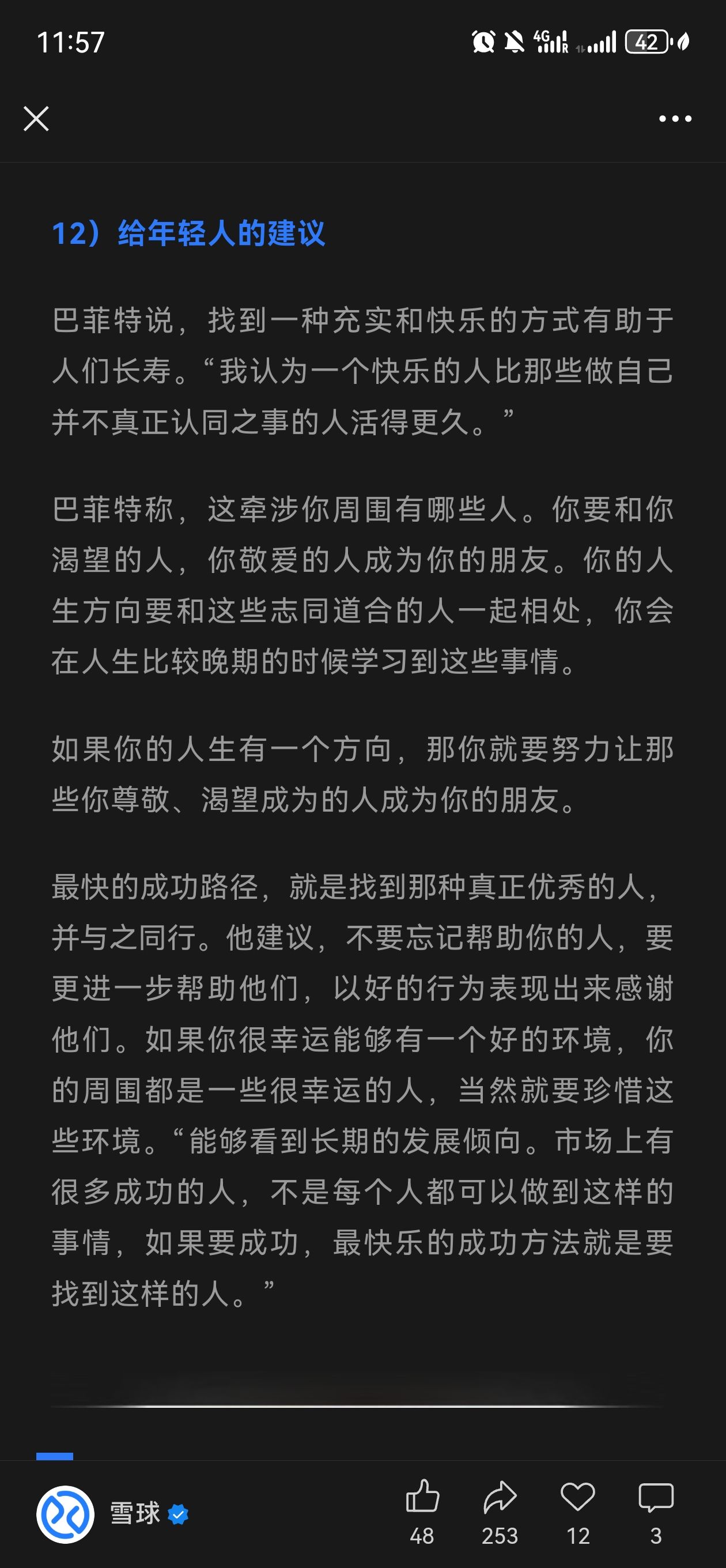 流明lumen951: 给自己放一天假 和XbotPark的老师,家人和朋友深度交流 信息资讯,想法,他人对你认知的深度改造 这相比于学校内的知识重要太多 因为这是学无字之书,学习如何做人 无字之书最难,因为关于人性和世界底层的运行规律,没有人点拨,没有人告诉你,都是看自己的悟性。所有的成功都是做人的成功,但究竟如何做人,这是极难的课题。 和 @坎儿哈哈 交换每周反思 创始人House 和 脑机接口公众号一定要搞 搞起来才能吸引到足够多的人一起快速成长 北京的创业氛围,科创氛围还是太弱 所有人想的都是分数,比赛,绩点 没人去想自己的未来,社会的发展方向,国家的未来,人类的未来 功利主义终会反噬自己 重新摘录几条收藏语录,提醒自己: 环境至关重要;搬到能让你最大程度成长的地方。让自己置身于必须全力以赴的环境中;如果可以平庸度日,你大概率会选择平庸。 快速行动。事情本身并不花太多时间( 用秒表计时的话 ),真正拖慢你的,是抗拒和拖延。“慢是假的。” 如果没有紧迫感,就人为制造一点。 财富是可以创造的,世界上的财富并不是固定的。一个人做得好,不一定意味着另一个人就会受损。 每天尽可能多地去做事,这是一种延长生命的方式。 始终保持高度诚信( high integrity ),即使这会让你付出代价。捷径不值得。 2025/5/25