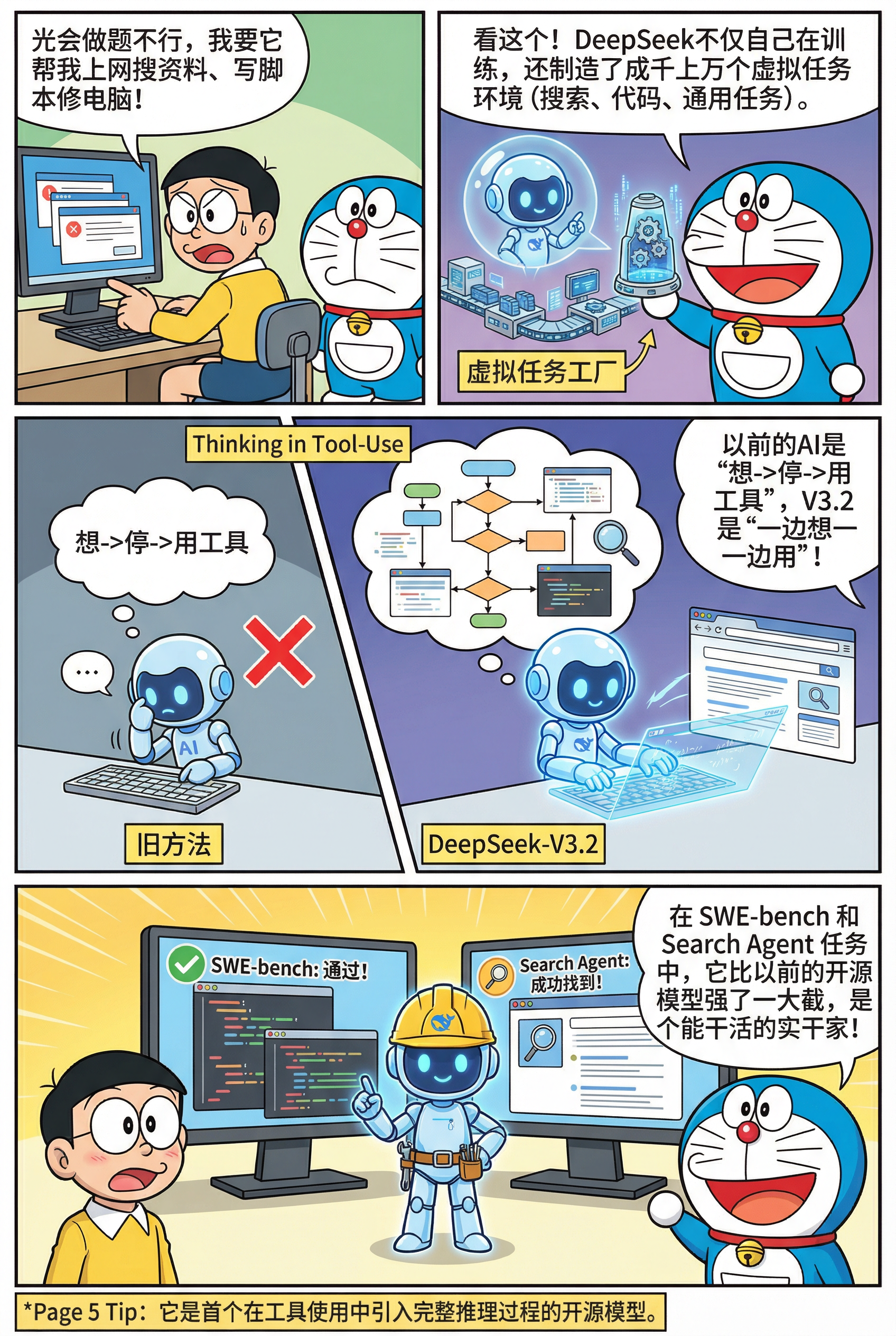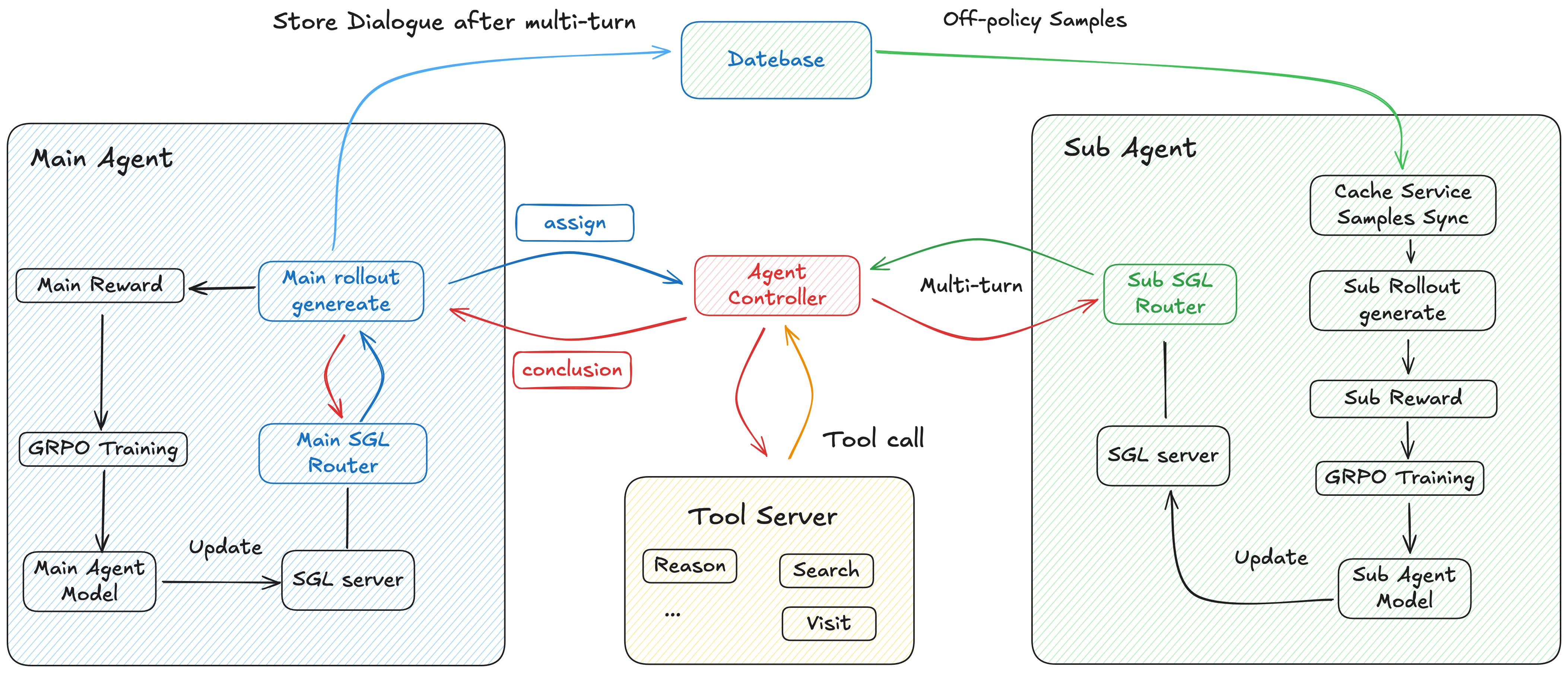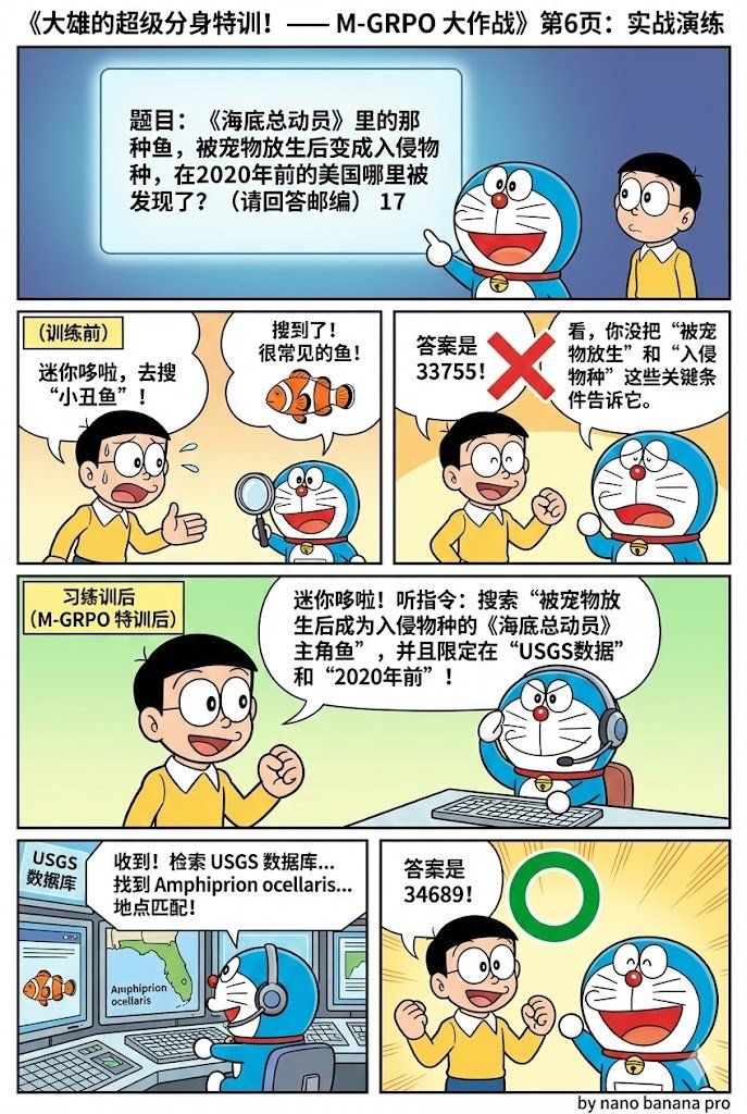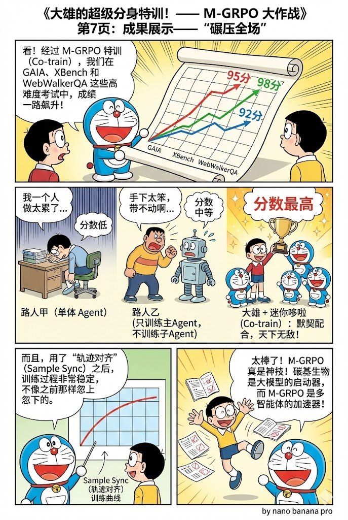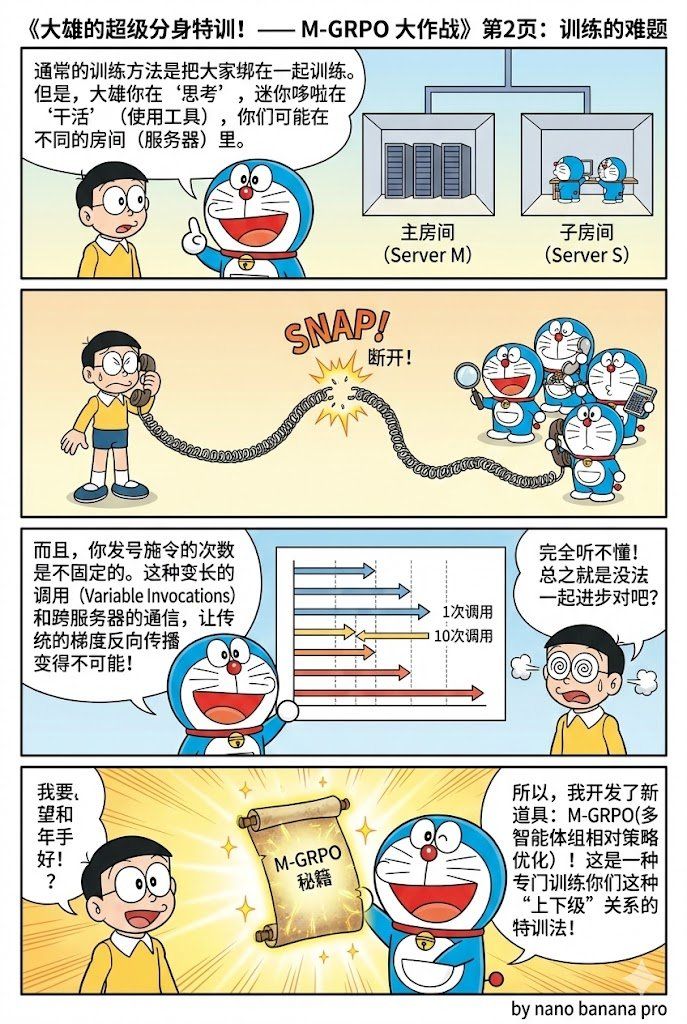 第二个场景更复杂:让 Agent 做深度研究。这里的问题是,当你需要频繁使用工具、查询信息时,单个 Agent 的“记忆”会爆炸:它要记住所有工具调用、所有中间结果,很快就撑不住了。解决方案?分工。让不同的 Agent 专注于不同的任务,同时让它们互相训练对方。一个负责主线推理,一个负责处理子任务。它们各自深化自己的专长,同时为对方生成训练样本。