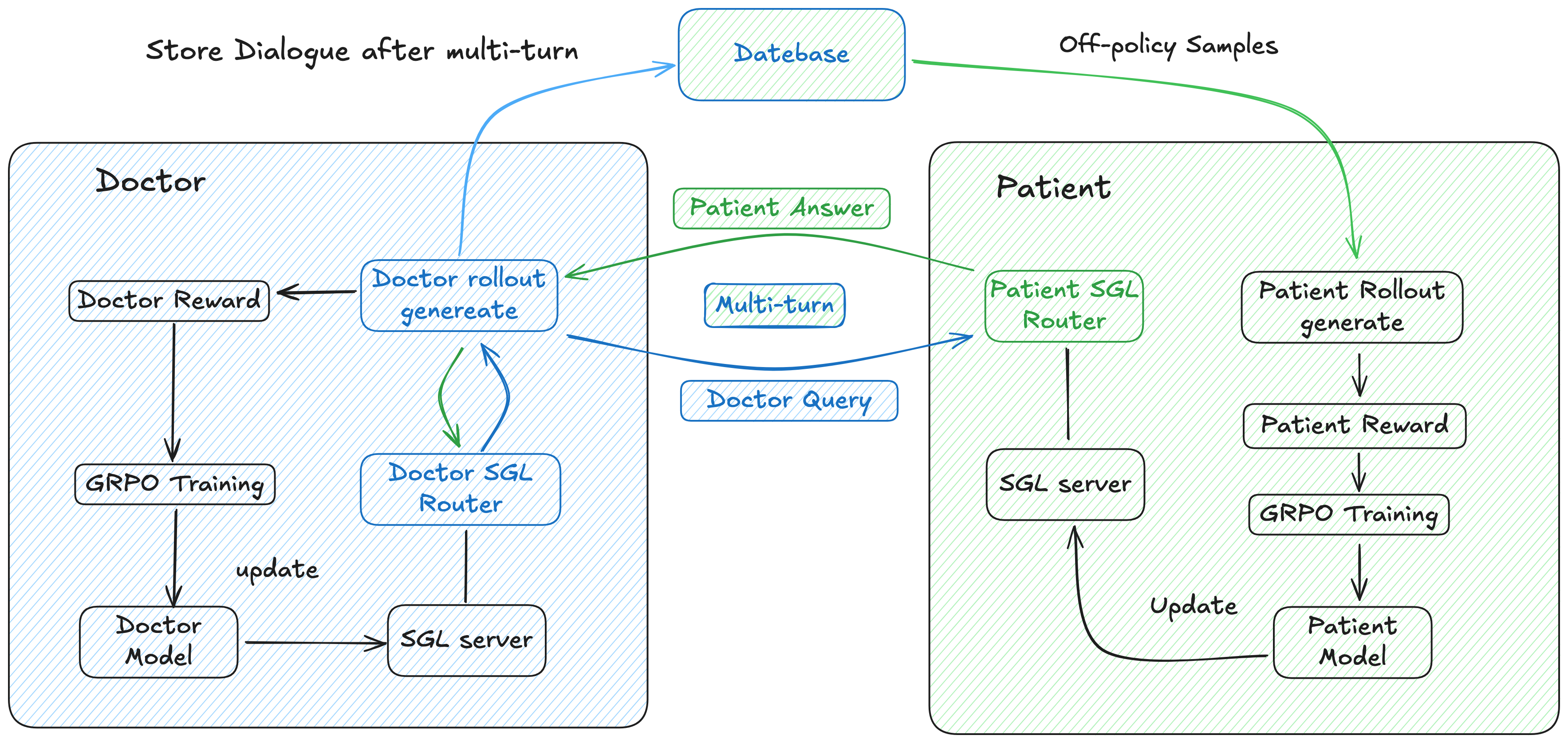 第一个是医生 - 病人对话训练。传统做法是只训练医生 Agent,但我们在思考一个问题:如果病人 Agent 也在进化,会不会让医生 Agent 进化更快?就像真实世界一样:好的病人能帮助医生成为更好的医生,反之亦然。结果证明,联合训练两者比只训练医生要强得多。