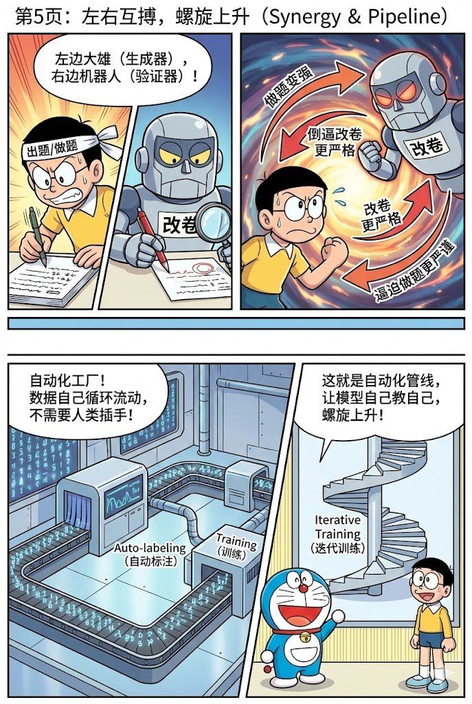 核心想法很简单:让两个 Agent 互相帮助对方成长。一个是“探索者”,负责在真实环境中冒险尝试;另一个是“适应者”,它观察刚刚发生的一切,然后快速调整自己。它们像台阶一样互相垫脚,螺旋式上升。