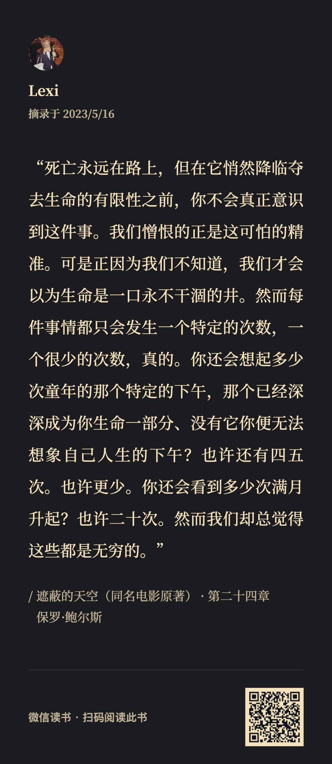 “死亡永远在路上,但在它悄然降临夺去生命的有限性之前,你不会真正意识到这件事。我们憎恨的正是这可怕的精准。