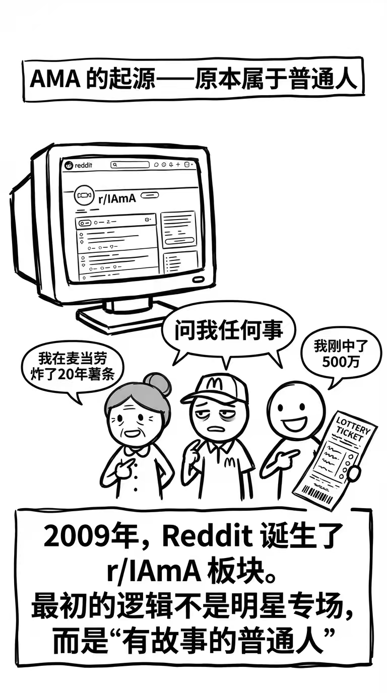 最初的逻辑并不是明星专场,而是有故事的普通人。比如: “我是一名百岁老人,AMA” / “我曾在麦当劳工作了20年,AMA” / “我刚刚中了彩票,AMA”。