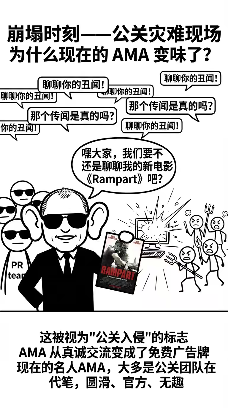 虽然现在 Reddit 上每天还有无数 AMA,但黄金时代确实结束了。在 2012 年,好莱坞演员伍迪·哈里森来做 AMA。无论网友问什么(比如他的陈年丑闻),他都只回一句话:“嘿大家,我们要不还是聊聊我的新电影《Rampart》吧?”
