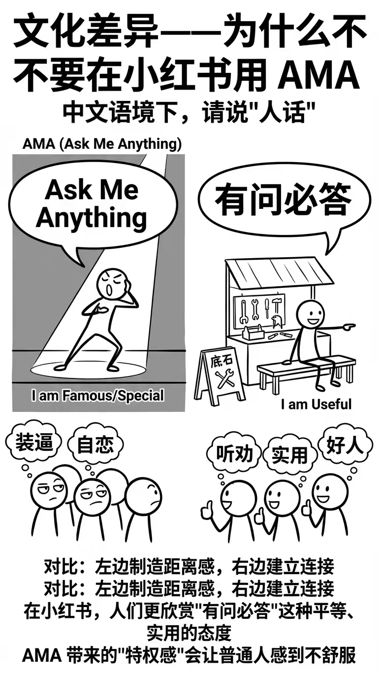 而在小红书上直接写英文 "Ask Me Anything",会给人一种装逼感。
