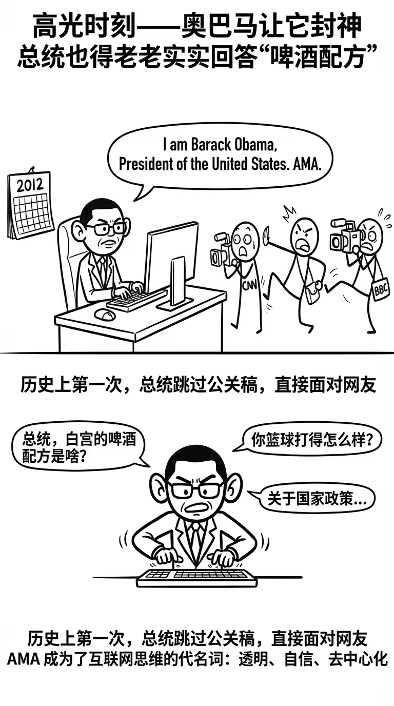 真正让 AMA 从小众玩法变成全球主流文化符号的,是 2012年8月,当时的美国总统奥巴马在竞选连任期间,突然空降 Reddit,发了一个帖子:"I am Barack Obama, President of the United States. AMA"