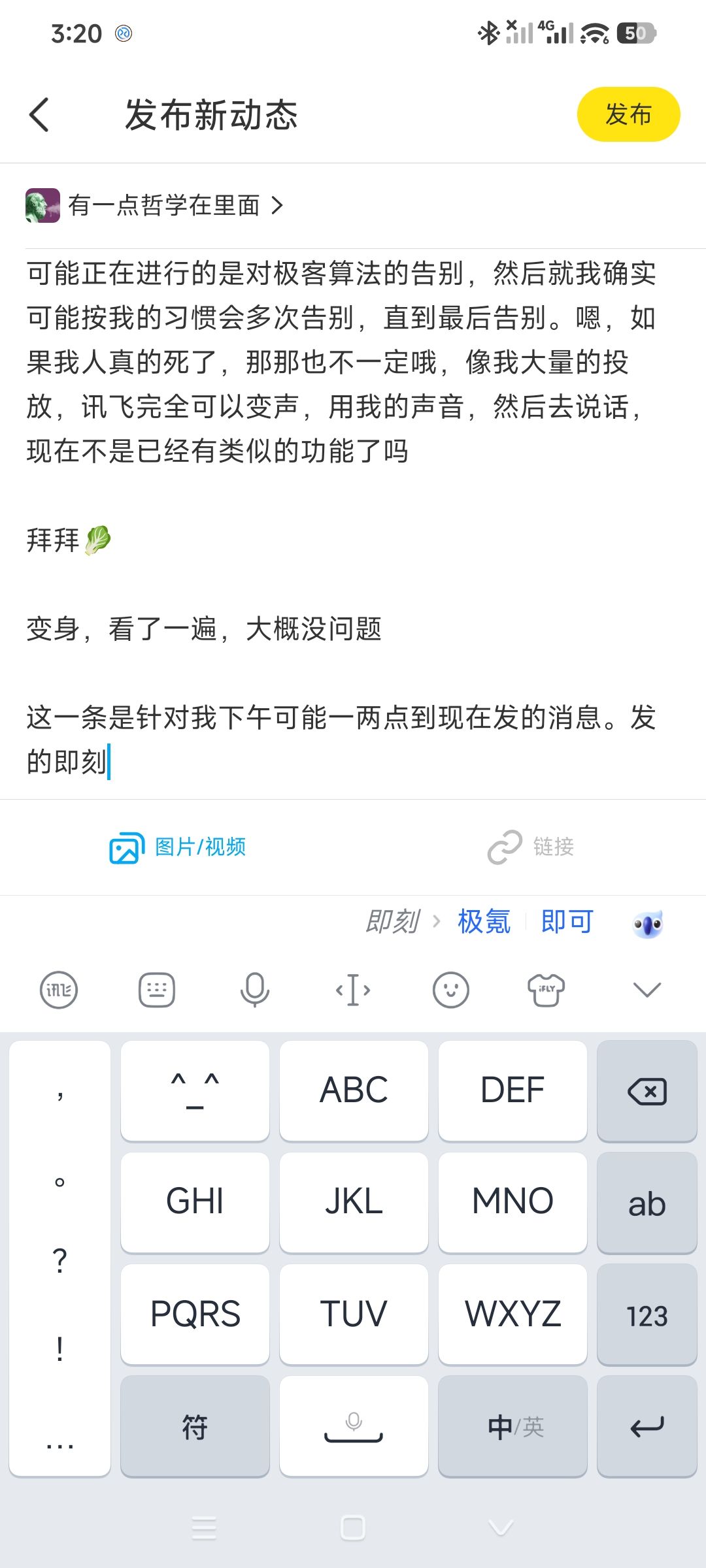 可能正在进行的是对极客算法的告别,然后就我确实可能按我的习惯会多次告别,直到最后告别。嗯,如果我人真的死了,那那也不一定哦,像我大量的投放,讯飞完全可以变声,用我的声音,然后去说话,现在不是已经有类似的功能了吗