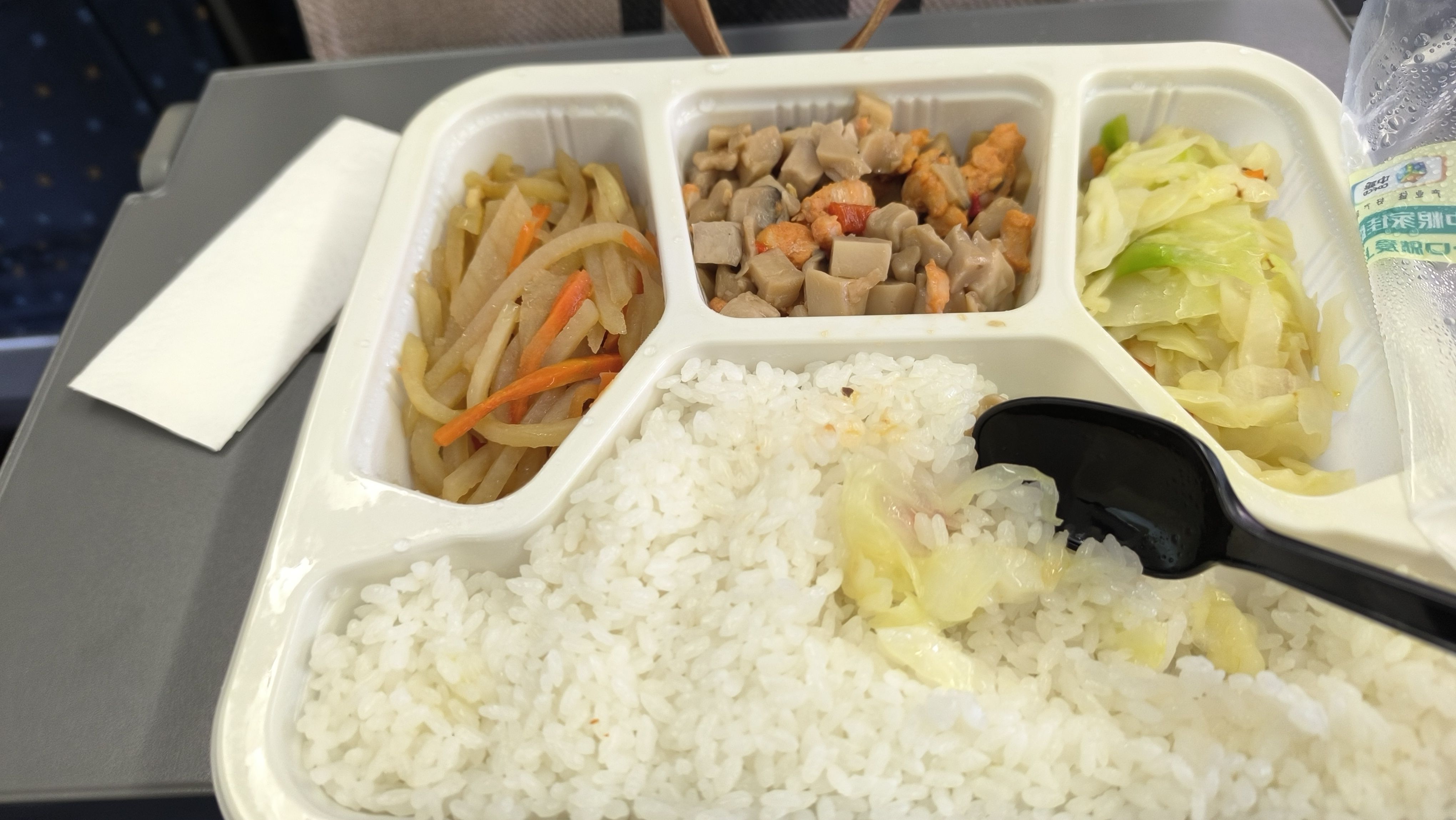 高铁上这个套餐,15块钱。有荤有素,米饭的品质很顶,考虑到高铁的定价水位,这个套餐令我如获至宝。