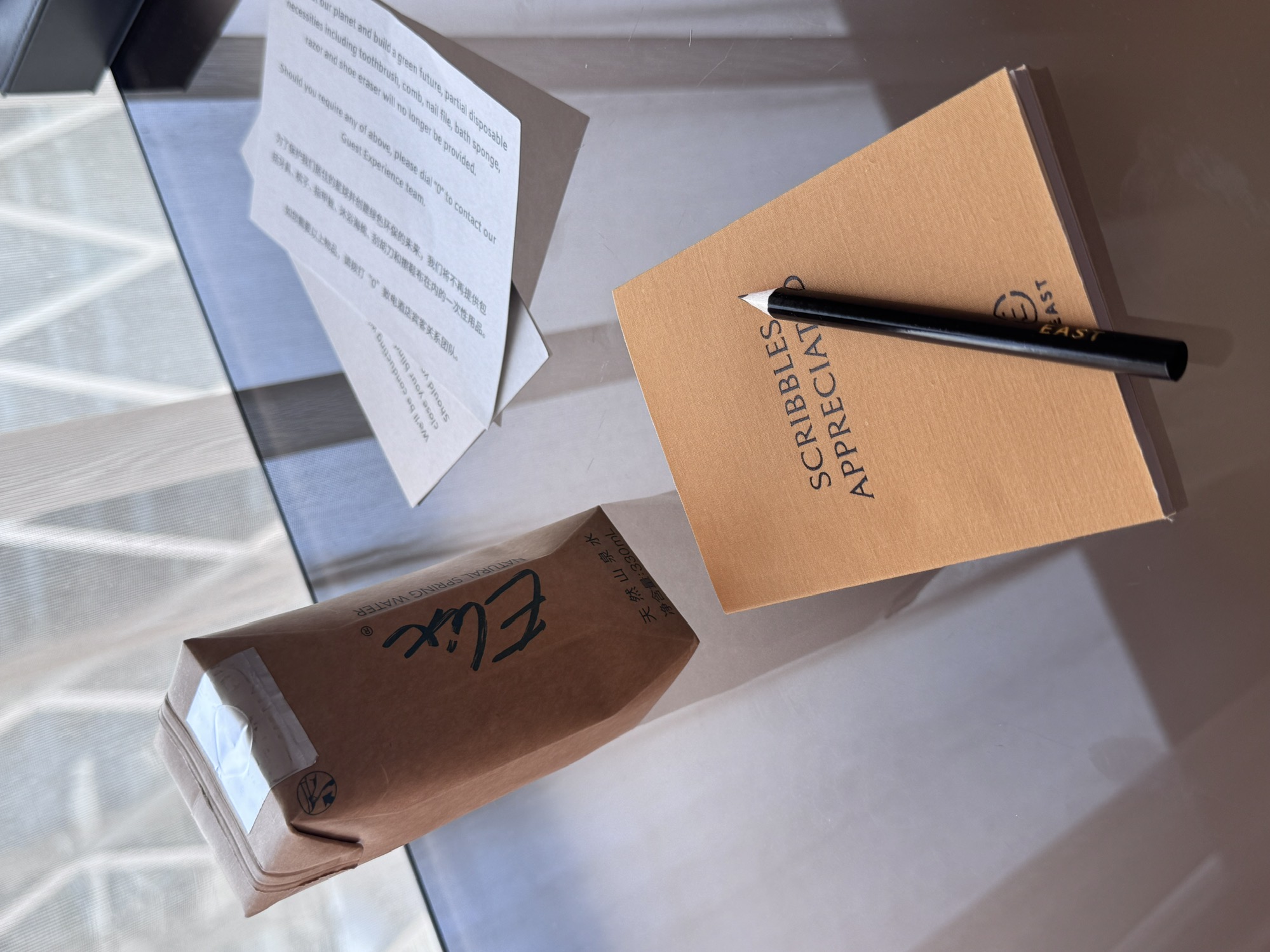 酒店推行无塑化,所以没有瓶装水,给的是这种利乐包装的山泉水,包装好看但实在说不上好喝