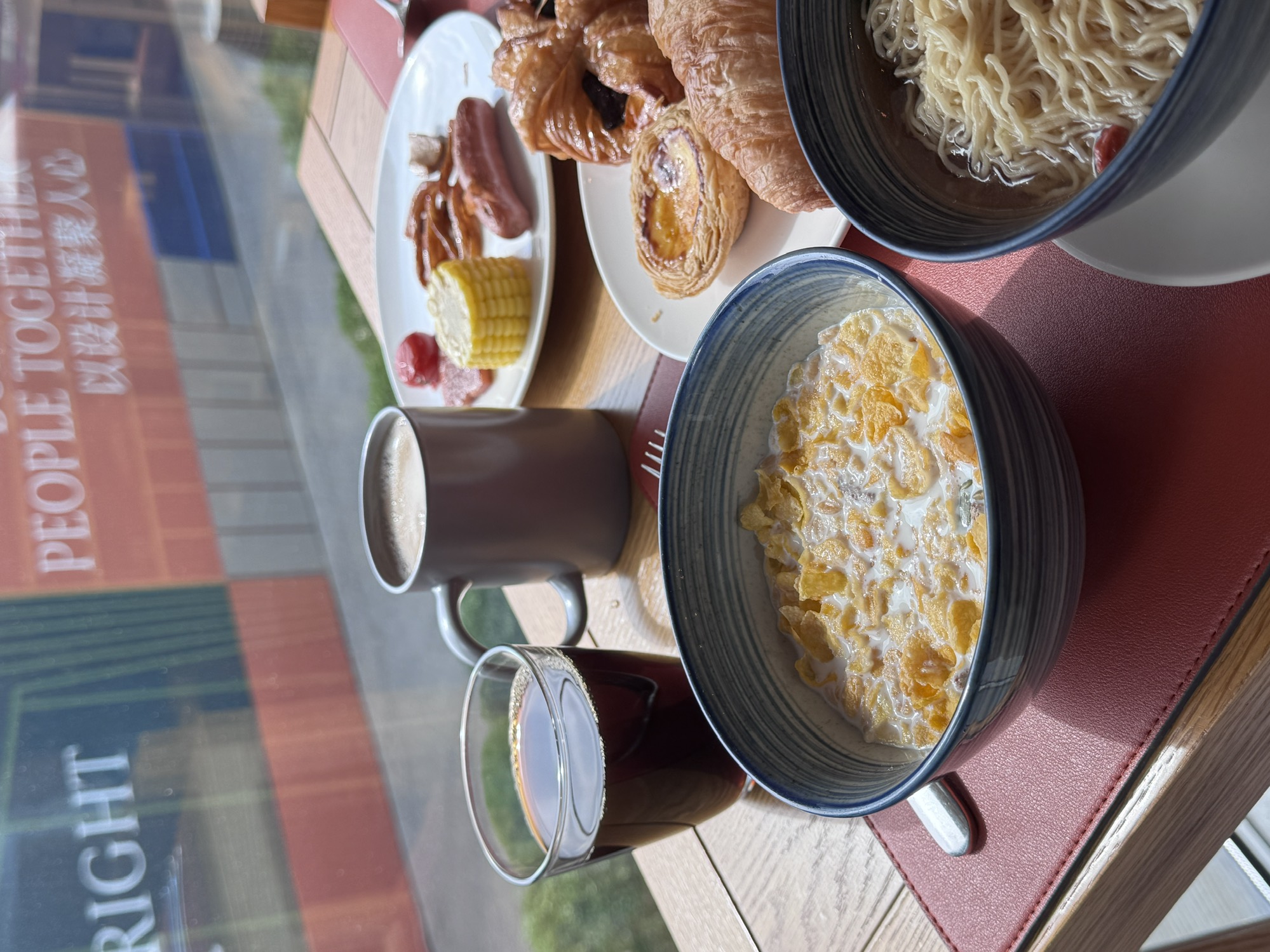 酒店早餐乍一看很好,但细节没做到位,没有不含糖的果蔬汁,西瓜放久了有氧化的味道,煎蛋没有分单双面,云吞馅少皮厚,不过面包做得不错,巧克力可颂是好吃的,难怪这家出名的是甜品自助……