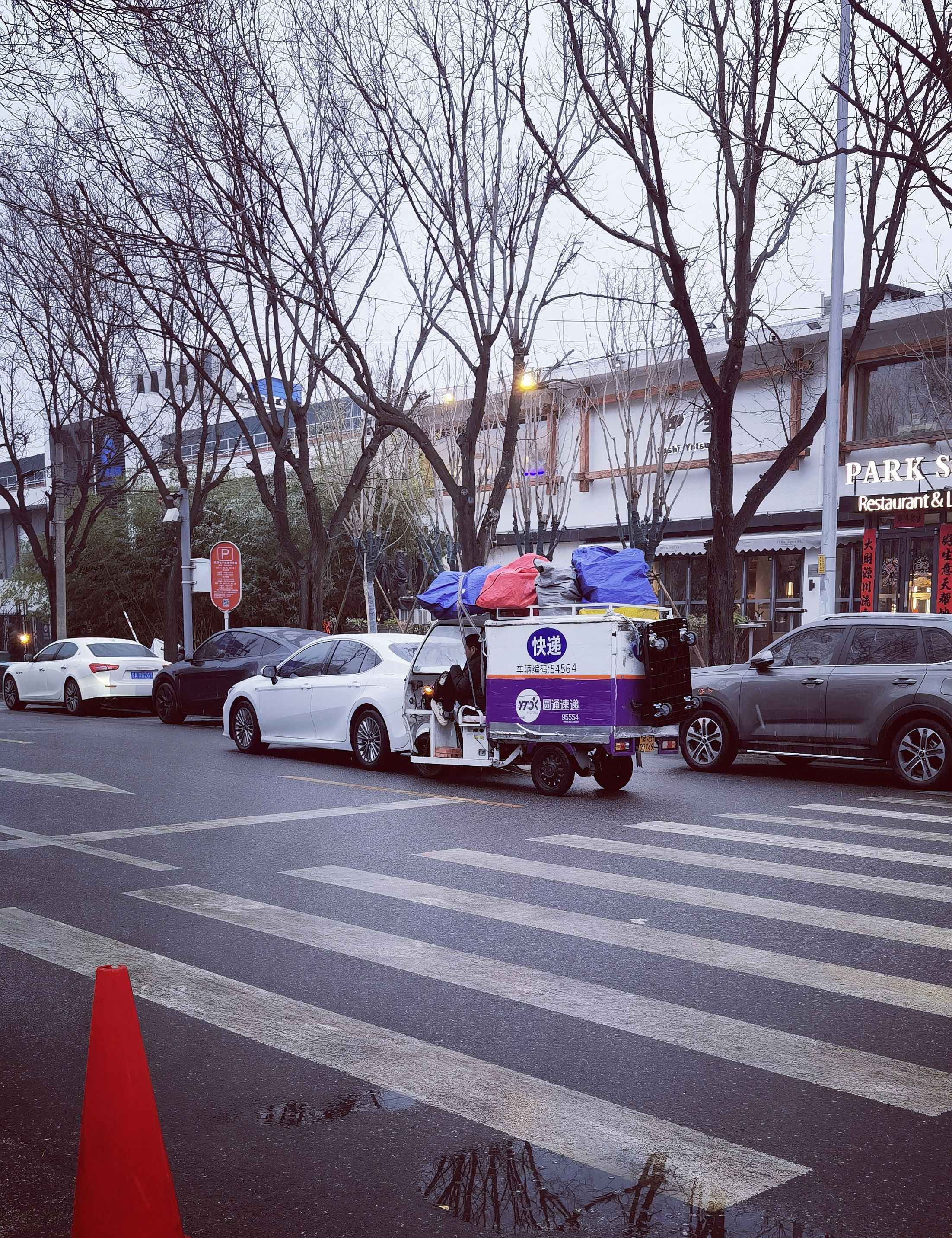 快递三蹦子跟人追尾 前车打着双闪
