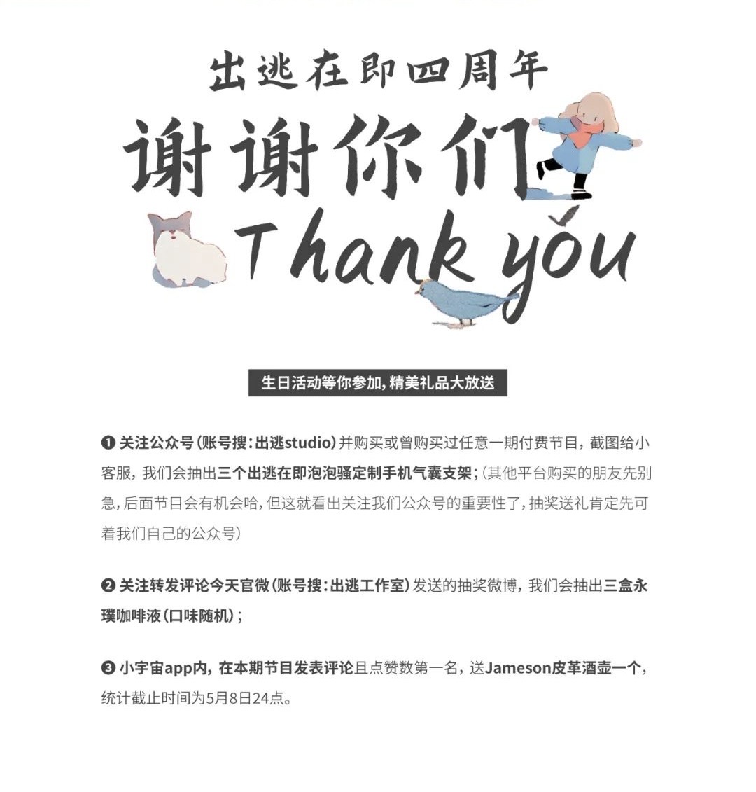 同时,每一期都会有礼物大奉送,礼物在图片里哈!而且每周玩法都不一样,活动信息请留意公众号【出逃studio】及微博【出逃工作室】,今天的活动信息请见下方图片,希望你我都被好运眷顾。