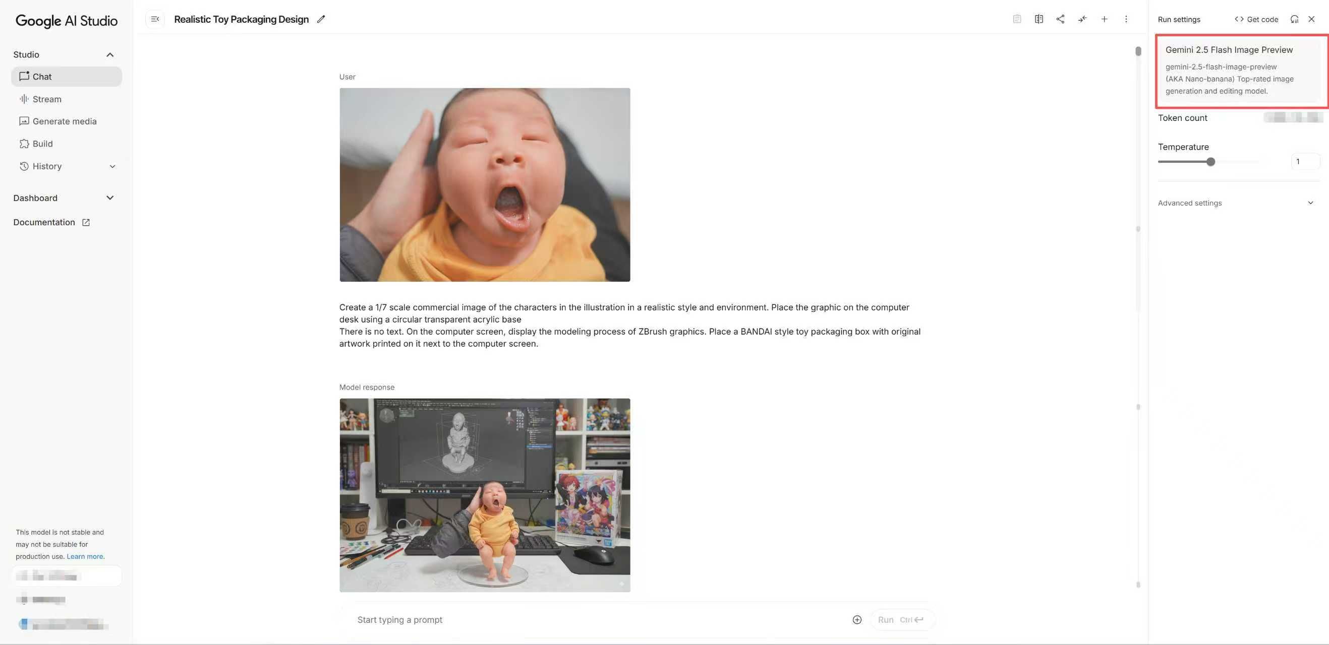 aistudio.google.com进入页面后,在页面最右侧将模型切换到 Gemini 2.5 Flash Image Preview 这个模型,这是 Nano Banana的官方名称。