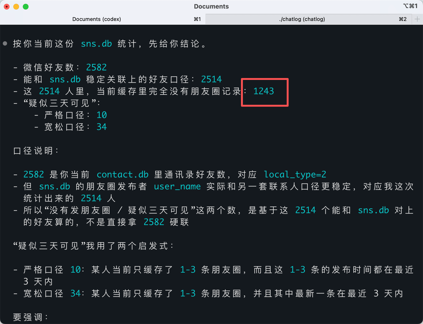 今天闲来无事,基于ChatLog二次开发了一个版本,支持读取朋友圈内容,并对微信好友们的状态做了个统计,原来有1200多人已经基本很少发朋友圈了。