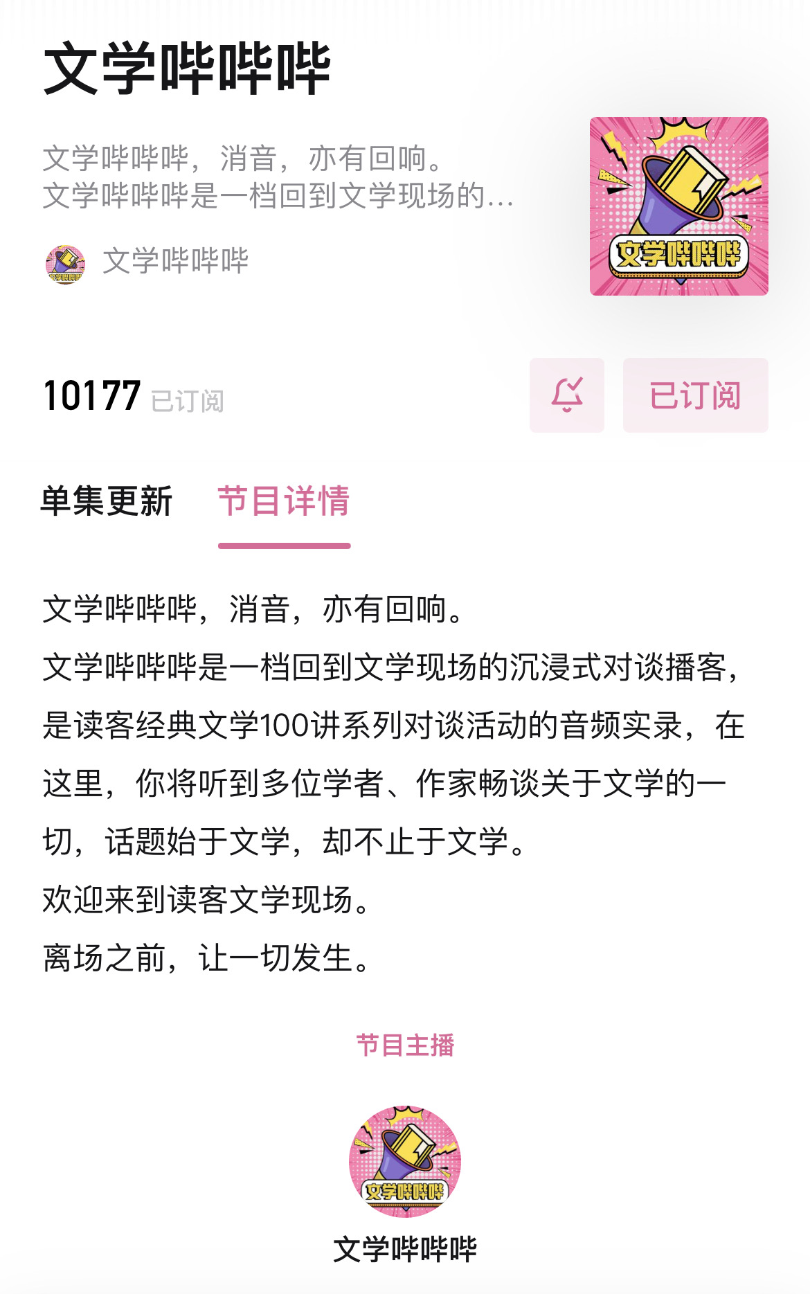 播客名“哔哔哔”是消音特效的拟声词,这档播客是读客三个圈经典100讲系列对谈活动的音频实录,在这里,你将听到多位学者、作家畅谈关于文学的一切,话题始于文学,却不止于文学。
